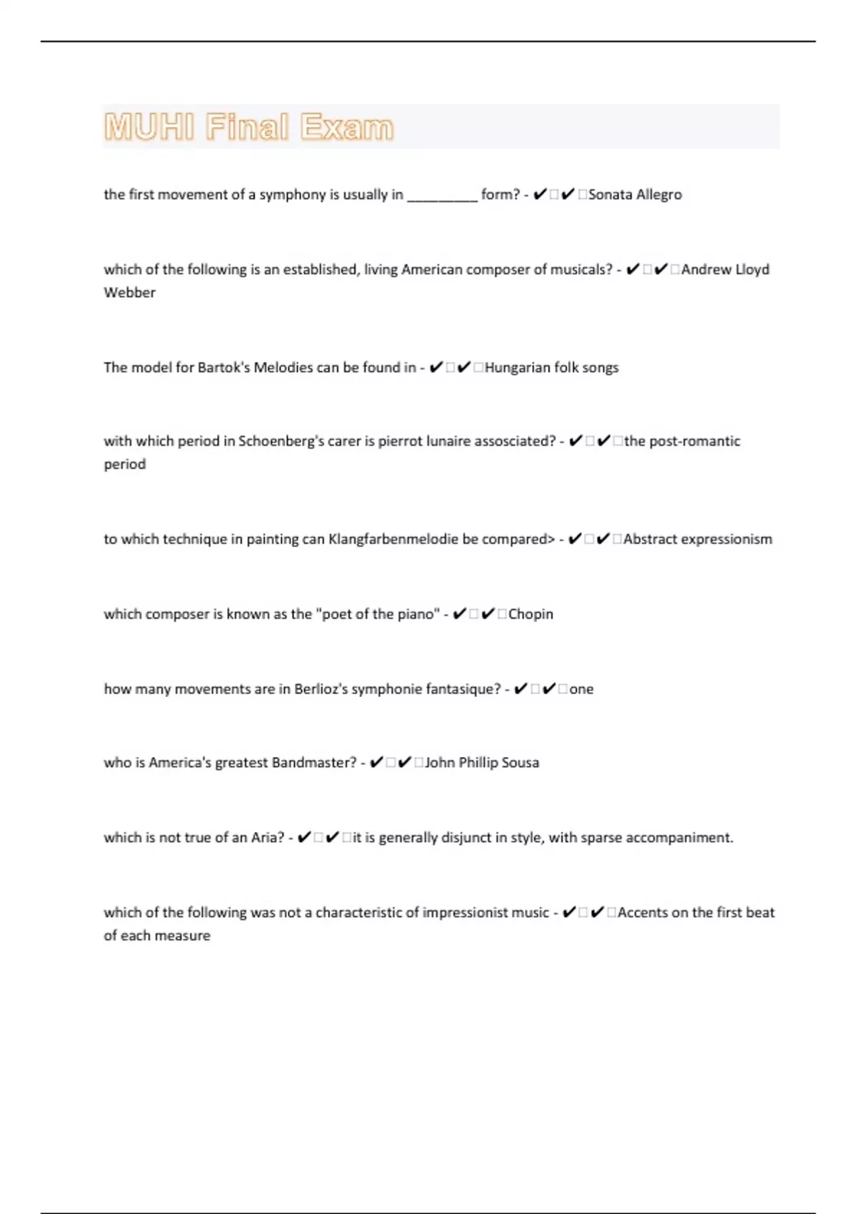 the first movement of a symphony is usually in _________ form? - ️️Sonata Allegro which of the following is an established, living American composer of musicals? - ️️Andrew Lloyd Webber The model for Bartok's Melodies can be found in - ️️Hungarian folk songs with which period in Schoenberg's carer is pierrot lunaire assosciated? - ️️the post-romantic period to which technique in painting can Klangfarbenmelodie be compared> - ️️Abstract expressionism which composer is known as the "poet of the piano" - ️️Chopin how many movements are in Berlioz's symphonie fantasique? - ️️one who is America's greatest Bandmaster? - ️️John Phillip Sousa which is not true of an Aria? - ️️it is generally disjunct in style, with sparse accompaniment. which of the following was not a characteristic of impressionist music - ️️Accents on the first beat of each measure