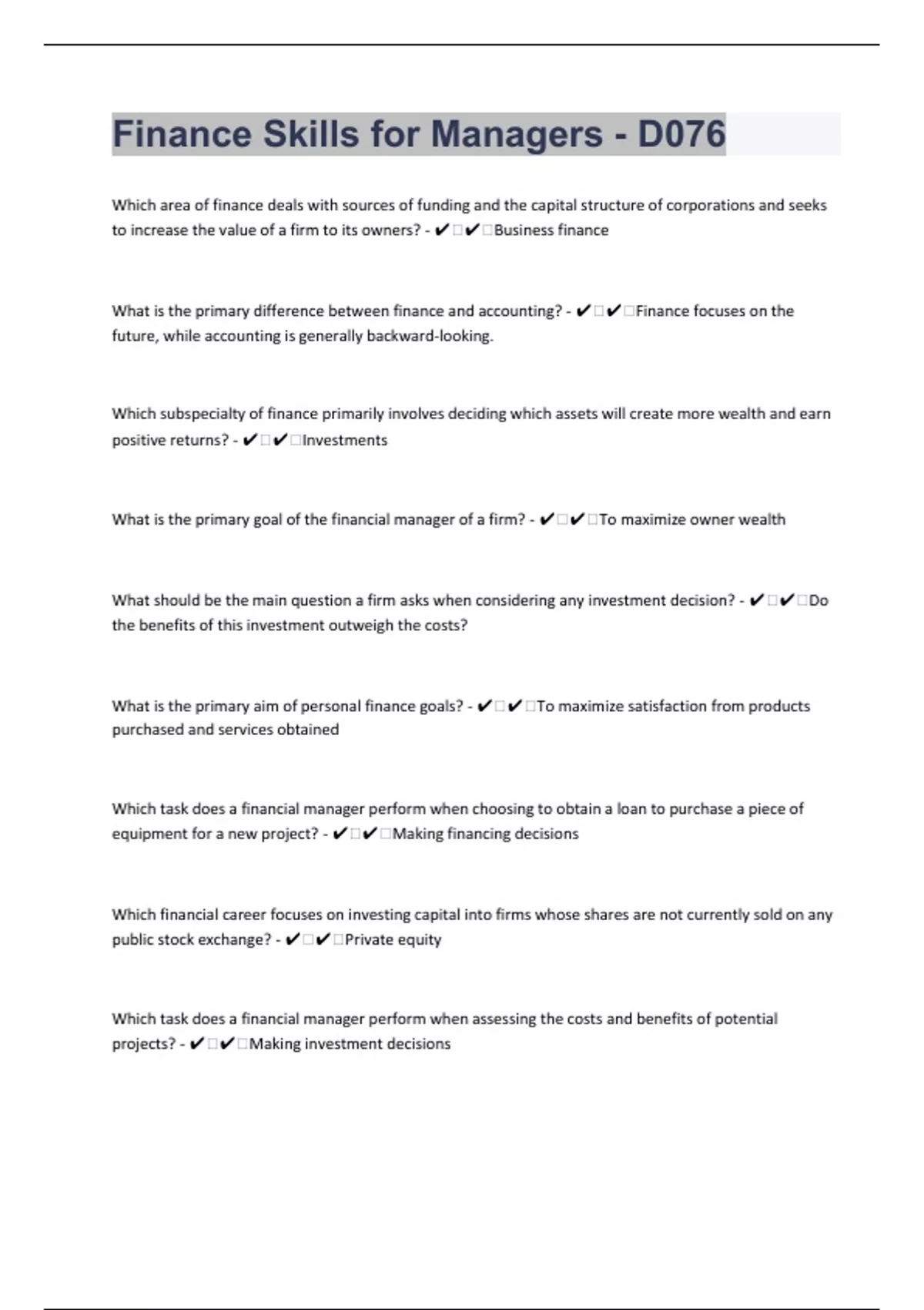 Finance Skills for Managers - D076 |459 Questions with 100% Correct Answers | Verified | Latest Update|49 Pages
