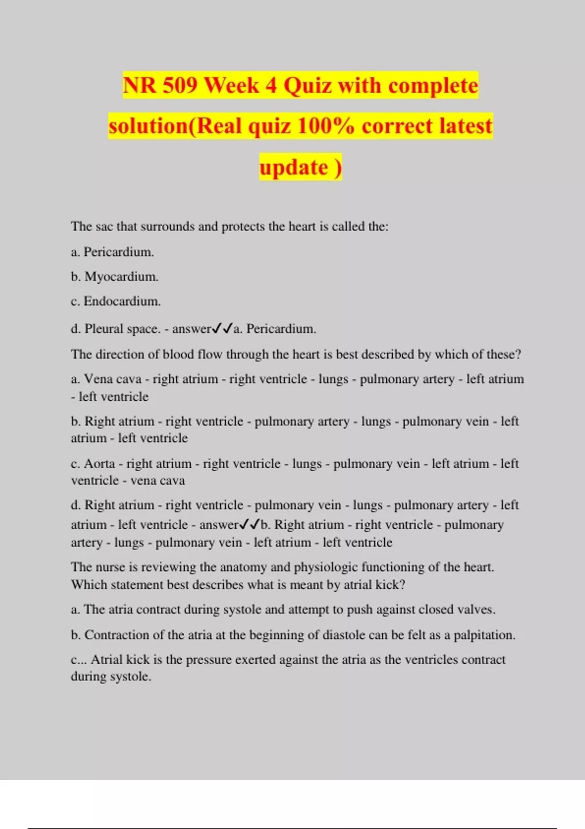 NR 509 Week 4 Quiz with complete solution(Real quiz 100% correct latest update ) The sac that surrounds and protects the heart is called the: a. Pericardium. b. Myocardium. c. Endocardium. d. Pleural space. - answera. Pericardium. The direction of blood flow through the heart is best described by which of these? a. Vena cava - right atrium - right ventricle - lungs - pulmonary artery - left atrium - left ventricle b. Right atrium - right ventricle - pulmonary artery - lungs - pulmonary vein - left atrium - left ventricle c. Aorta - right atrium - right ventricle - lungs - pulmonary vein - left atrium - left ventricle - vena cava d. Right atrium - right ventricle - pulmonary vein - lungs - pulmonary artery - left atrium - left ventricle - answerb. Right atrium - right ventricle - pulmonary artery - lungs - pulmonary vein - left atrium - left ventricle The nurse is reviewing the anatomy and physiologic functioning of the heart. Which statement best describes what is meant by atrial kick? a. The atria contract during systole and attempt to push against closed valves. b. Contraction of the atria at the beginning of diastole can be felt as a palpitation. c... Atrial kick is the pressure exerted against the atria as the ventricles contract during systole. d. The atria contract toward the end of diastole and push the remaining blood into the ventricles. - answerd. The atria contract toward the end of diastole and push the remaining blood into the ventricles. When listening to heart sounds, the nurse knows the valve closures that can be heard best at the base of the heart are: a. Mitral and tricuspid. b. Tricuspid and aortic. c. Aortic and pulmonic. d. Mitral and pulmonic. - answerc. A