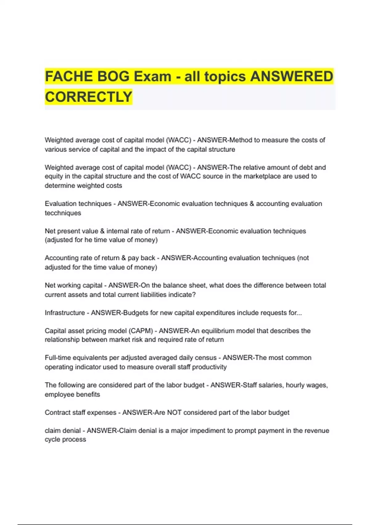 FACHE BOG Exam - all topics ANSWERED CORRECTLY Weighted average cost of capital model (WACC) - ANSWER-Method to measure the costs of various service of capital and the impact of the capital structure Weighted average cost of capital model (WACC) - ANSWER-The relative amount of debt and equity in the capital structure and the cost of WACC source in the marketplace are used to determine weighted costs Evaluation techniques - ANSWER-Economic evaluation techniques & accounting evaluation tecchniques Net pre
