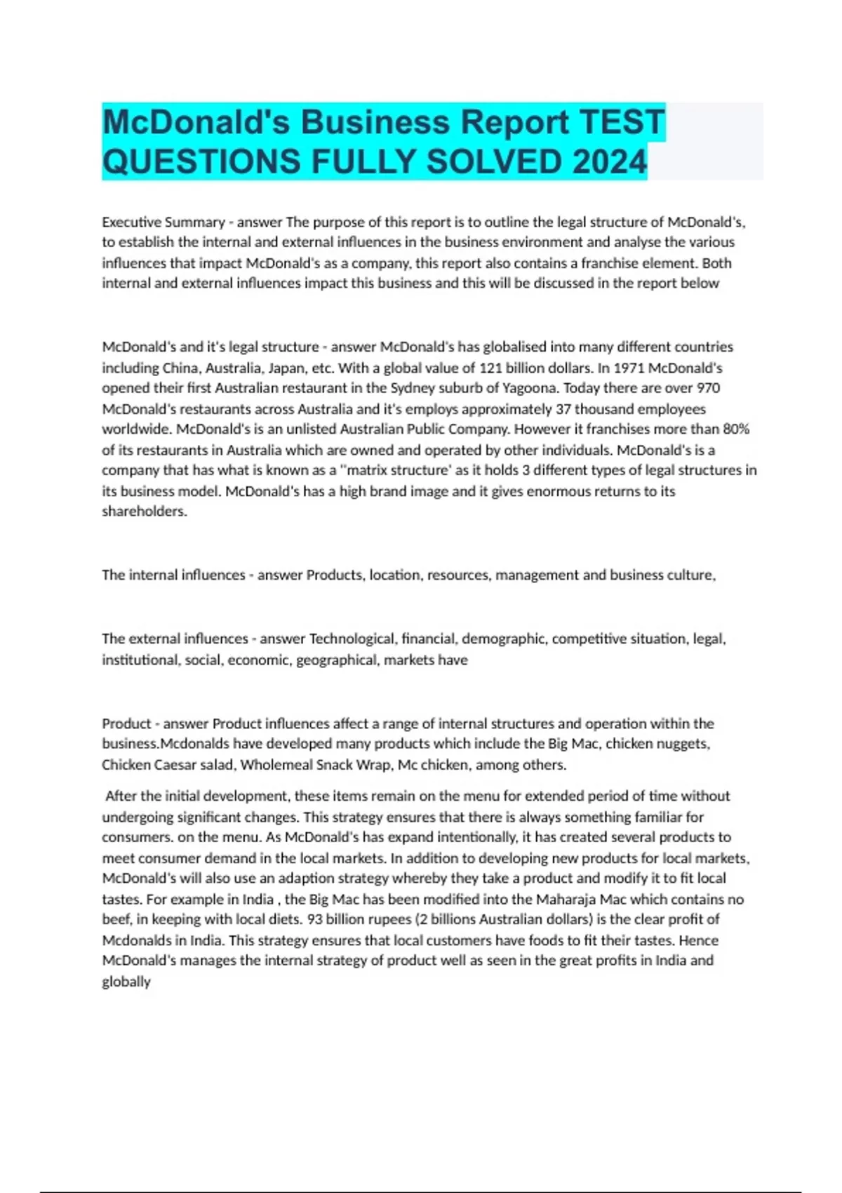 McDonald'S Business Report TEST QUESTIONS FULLY SOLVED 2024.