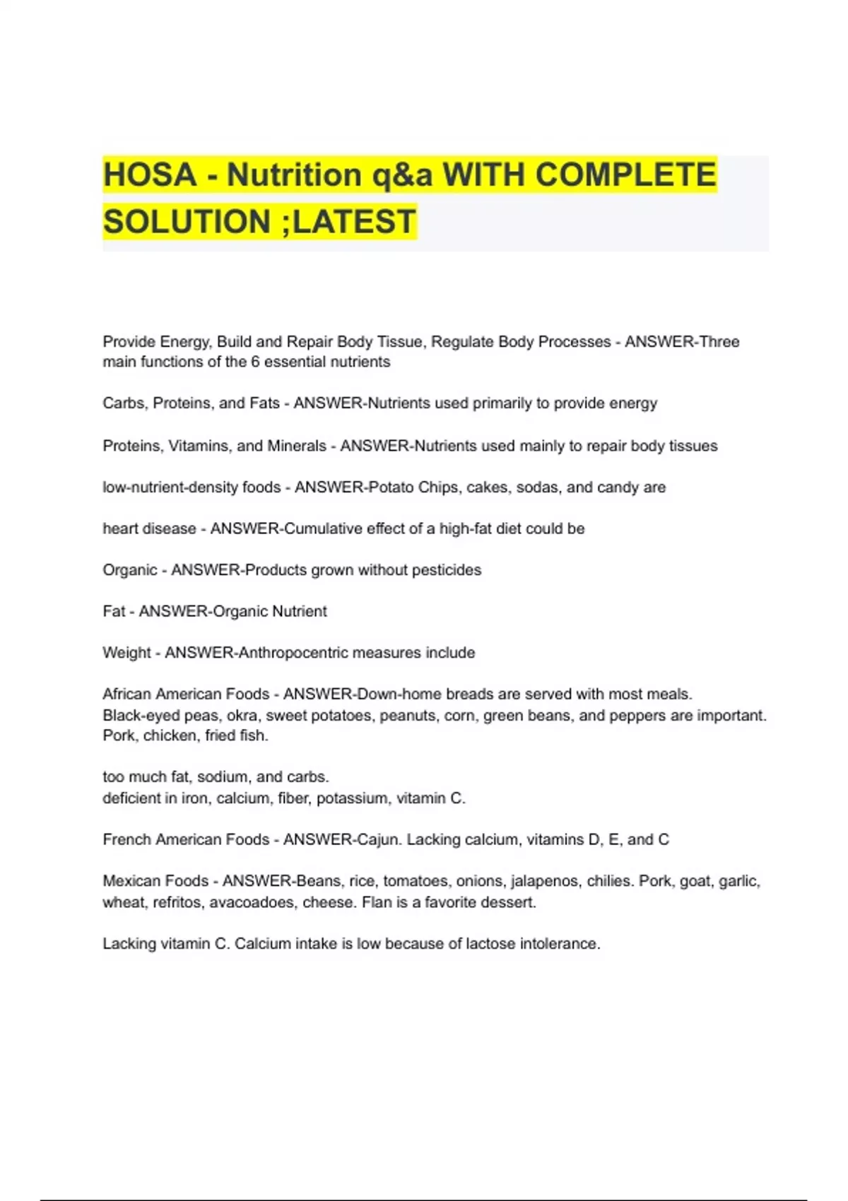 - HOSA - Nutrition q&a WITH COMPLETE SOLUTION ;LATES
