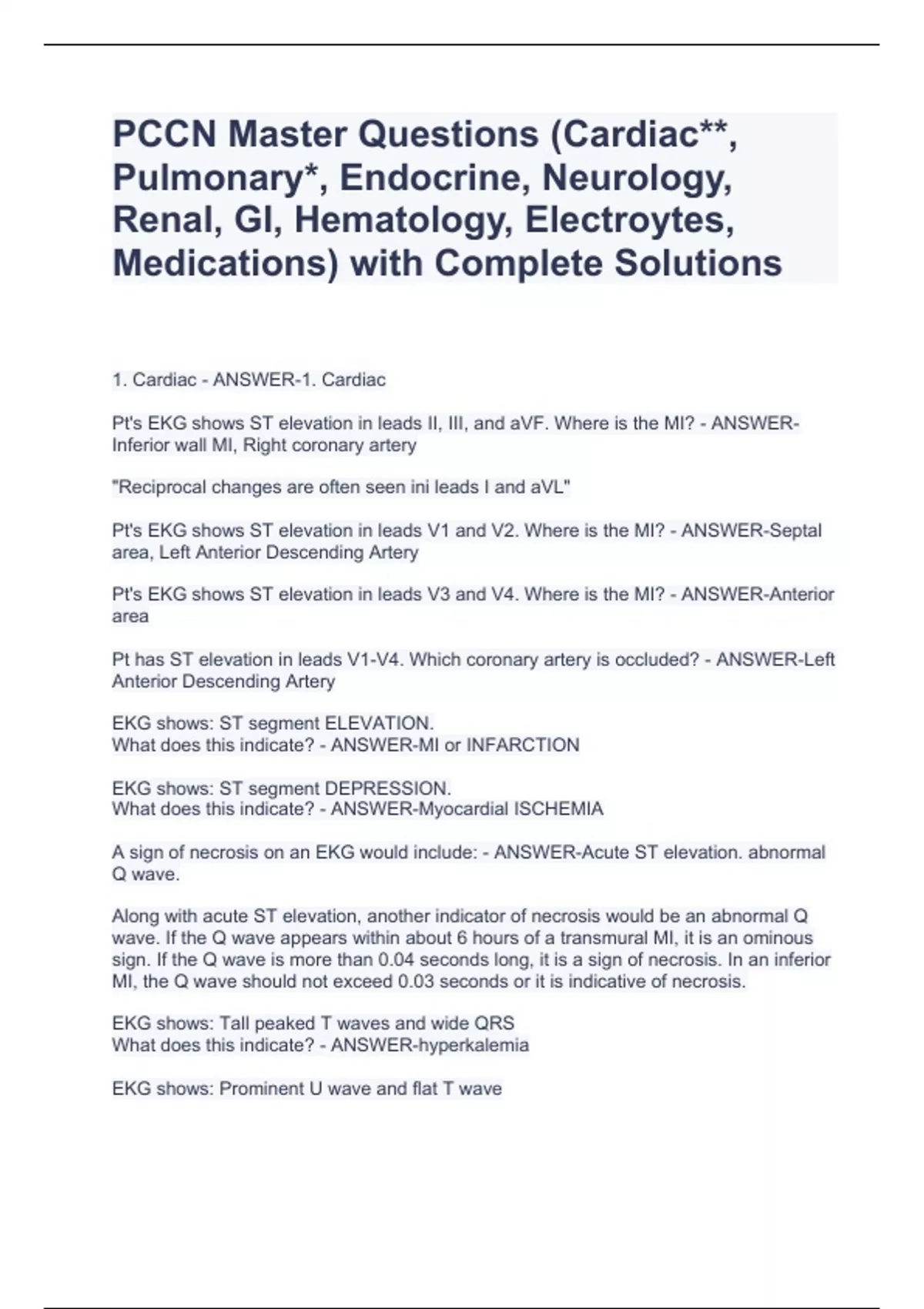 PCCN Master Questions (Cardiac**, Pulmonary*, Endocrine, Neurology, Renal, GI, Hematology, Electroytes, Medications) with Complete Solutions PCCN Master Questions (Cardiac**, Pulmonary*, Endocrine, Neurology, Renal, GI, Hematology, Electroytes, Medications) with Complete Solutions PCCN Master Questions (Cardiac**, Pulmonary*, Endocrine, Neurology, Renal, GI, Hematology, Electroytes, Medications) with Complete Solutions 1. Cardiac - ANSWER-1. Cardiac Pt's EKG shows ST elevation in leads II, III, and aVF. Where is the MI? - ANSWER-Inferior wall MI, Right coronary artery "Reciprocal changes are often seen ini leads I and aVL" Pt's EKG shows ST elevation in leads V1 and V2. Where is the MI? - ANSWER-Septal area, Left Anterior Descending Artery Pt's EKG shows ST elevation in leads V3 and V4. Where is the MI? - ANSWER-Anterior area Pt has ST elevation in leads V1-V4. Which coronary artery is occluded? - ANSWER-Left Anterior Descending Artery EKG shows: ST segment ELEVATION. What does this indicate? - ANSWER-MI or INFARCTION EKG shows: ST segment DEPRESSION. What does this indicate? - ANSWER-Myocardial ISCHEMIA A sign of necrosis on an EKG would include: - ANSWER-Acute ST elevation. abnormal