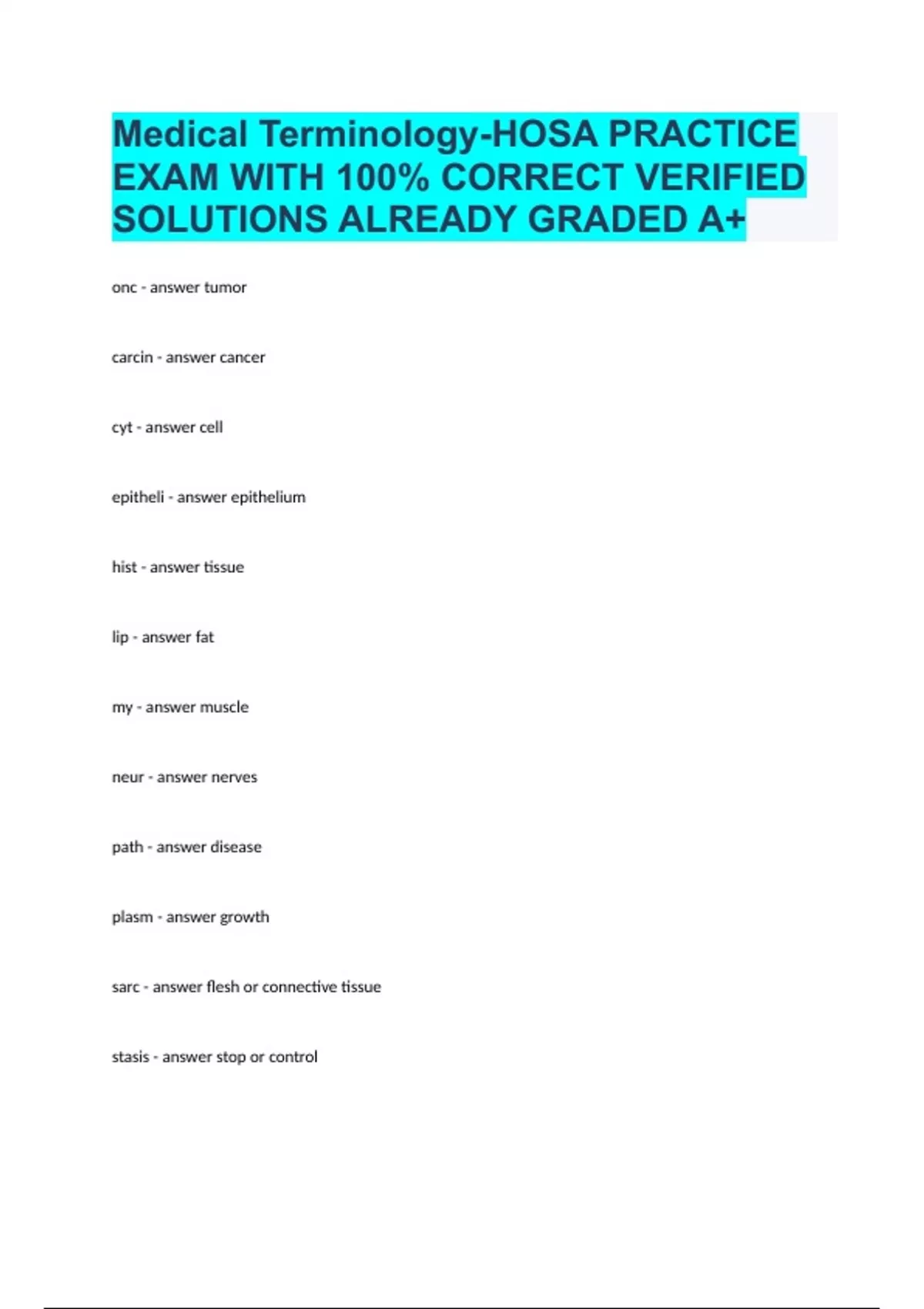 Medical Terminology-HOSA PRACTICE EXAM WITH 100% CORRECT VERIFIED SOLUTIONS ALREADY GRADED A+