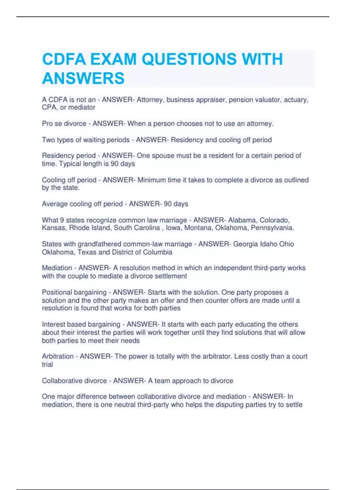CDFA EXAM QUESTIONS WITH ANSWERS A CDFA is not an - ANSWER- Attorney, business appraiser, pension valuator, actuary, CPA, or mediator Pro se divorce - ANSWER- When a person chooses not to use an attorney. Two types of waiting periods - ANSWER- Residency and cooling off period Residency period - ANSWER- One spouse must be a resident for a certain period of time. Typical length is 90 days Cooling off period - ANSWER- Minimum time it takes to complete a divorce as outlined by the state. Average cooling off period - ANSWER- 90 days What 9 states recognize common law marriage - ANSWER- Alabama, Colorado, Kansas, Rhode Island, South Carolina , Iowa, Montana, Oklahoma, Pennsylvania. States with grandfathered common-law marriage - ANSWER- Georgia Idaho Ohio Oklahoma, Texas and District of Columbia Mediation - ANSWER- A resolution method in which an independent third-party works with the couple to mediate a divorce settlement Positional bargaining - ANSWER- Starts with the solution. One party proposes a solution and the other party makes an offer and then counter offers are made until a resolution is found that works for both parties Interest based bargaining - ANSWER- It starts with each party educating the others about their interest the parties will work together until they find solutions that will allow both parties to meet their needs Arbitration - ANSWER- The power is totally with the arbitrator. Less costly than a court trial Collaborative divorce - ANSWER- A team approach to divorce One major difference between collaborative divorce and mediation - ANSWER- In mediation, there is one neutral third-party who helps the disputing parties try to settle the case. And collaborative divorce all parties are present and caboodle to settlement as their sole agenda Discovery - ANSWER- The process of gathering information about the nature, scope, and credibility of the opposing parties claim Formal and informal - ANSWER- The two types of discovery Depositions - ANSWER- Sworn testimony of a witness taken outside of court in the presence of lawyers for each side Interrogatories - ANSWER- A series of written questions submitted to the other party Request for production of documents - ANSWER- Requires the other party and third parties to produce documents necessary to understand the issues in the case Informal discovery - ANSWER- Can be as simple as one lawyer calling the other lawyer and saying send me everything you have on the Smith case including financial affidavits Appeals - ANSWER- If one of the divorce party strongly opposes the judges decision he or she can do this Error of law or abuse of discretion - ANSWER- Two reasons that you can file for an appeal Failure to file or amend documents - ANSWER- One issue often faced by divorcees is finding out after the divorce has been filed that certain documents have not been amended or filed 26 - ANSWER- If you are paid biweekly you receive this many paychecks 24 - ANSWER- If you're paid semi monthly you receive this many paychecks $106,800 - ANSWER- Maximum amount subject to Social Security taxes 4.2% - ANSWER- Tax rate of the Social Security taxes $374 - ANSWER- $106,800 * 4.2%12 Average monthly social security contribution Voir dire - ANSWER- You'll be asked questions designed to disqualify you by showing that you are not an expert or to show the judge why less weight should be placed on your testimony 1.45% - ANSWER- Current Medicare tax rate 100% - ANSWER- How much of the income is taxable to Medicare 401K contribution - ANSWER- Cannot be counted on the financial affidavit because it's a voluntary contribution 0.0833 - ANSWER- If you receive an annual one time bonus it should be multiplied by ____ to obtain it's monthly income Interrogatories - ANSWER- A CDFA professional is not trained to interview client to complete answers to True - ANSWER- A judge can rej