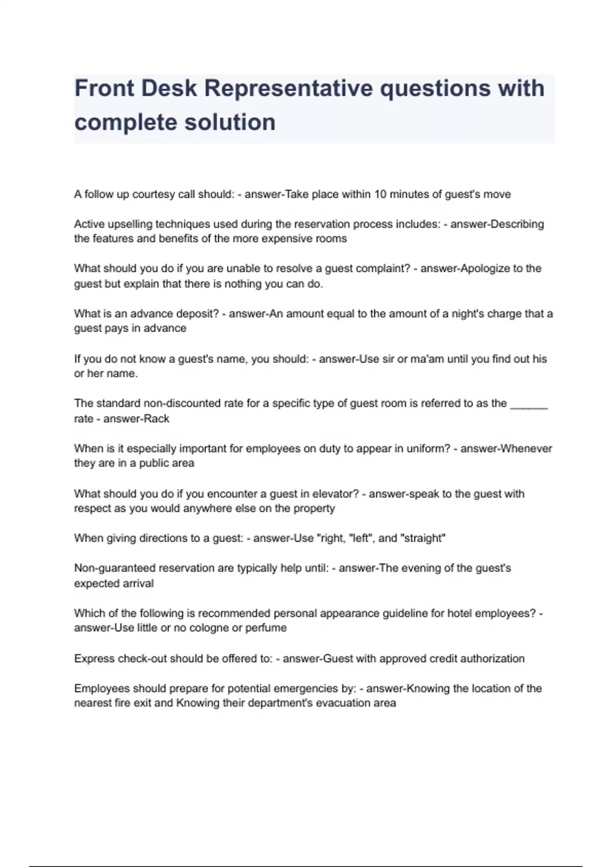 Front Desk Representative questions with complete solution