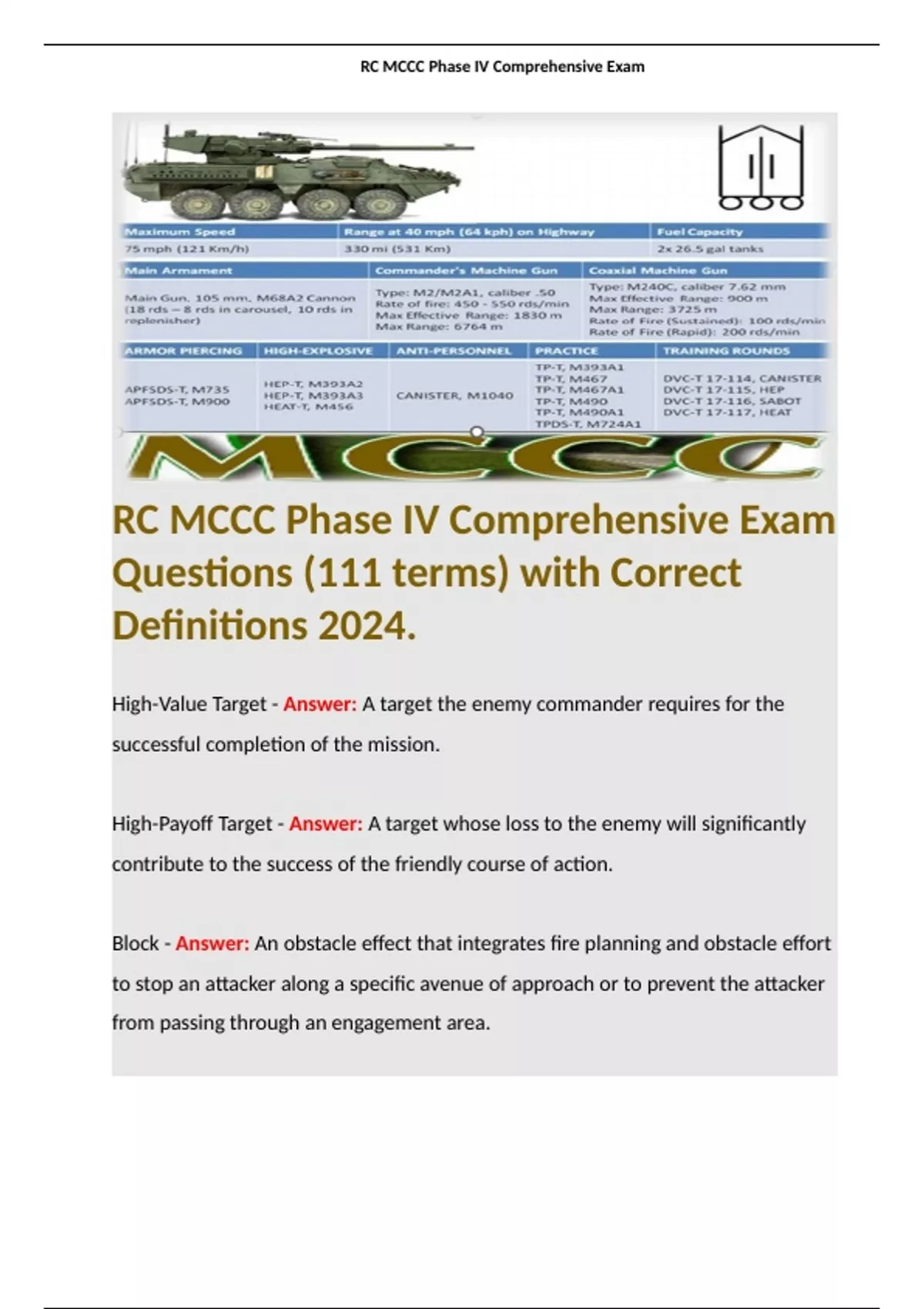 RC MCCC Phase IV Comprehensive Exam Questions (111 terms) with Correct Definitions 2024. Terms like: High-Value Target - Answer: A target the enemy commander requires for the successful completion of the mission.
