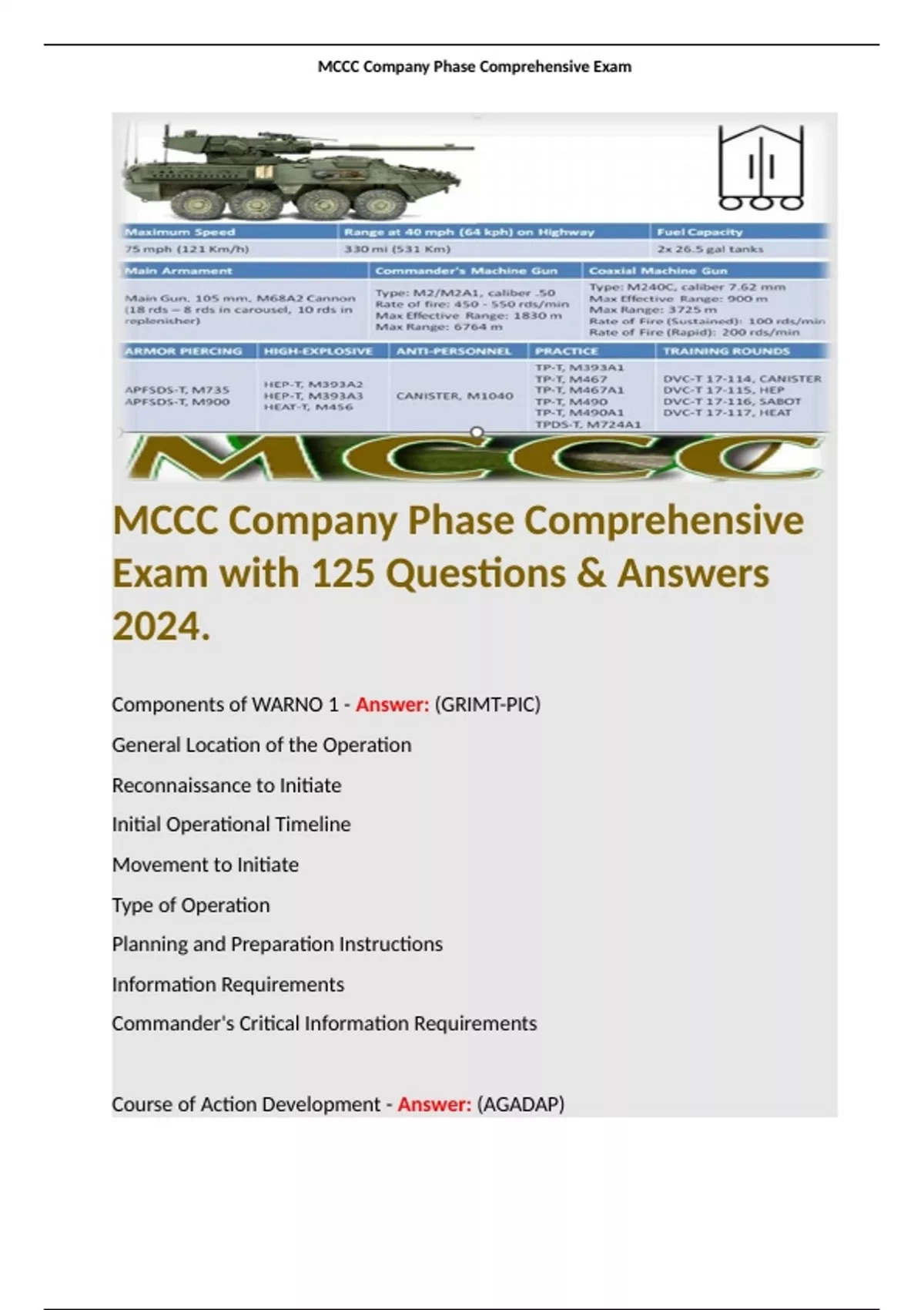 MCCC Company Phase Comprehensive Exam with 125 Questions & Answers 2024. Terms like; Components of WARNO 1 - Answer: (GRIMT-PIC) General Location of the Operation Reconnaissance to Initiate Initial Operational Timeline Movement to Initiate Type of Operation Planning and Preparation Instructions Information Requirements Commander's Critical Information Requirements