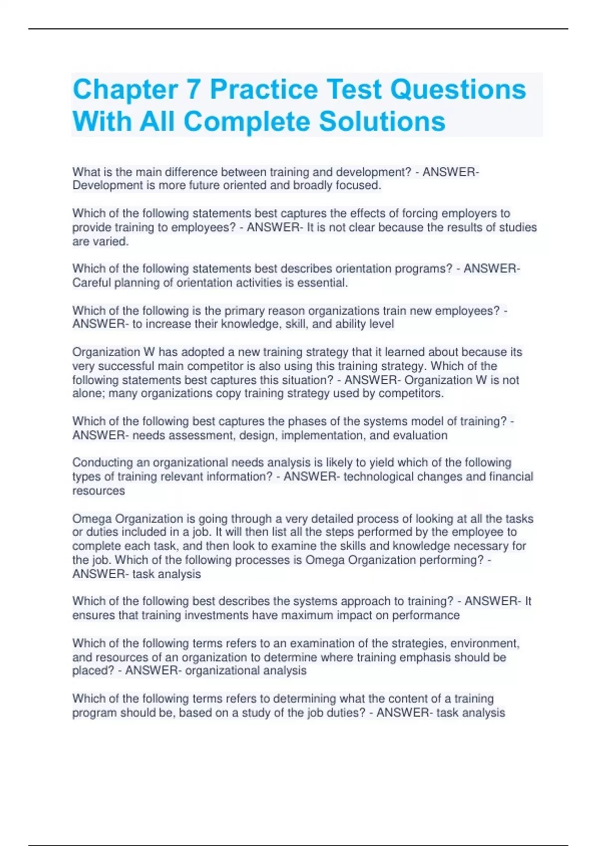 Chapter 7 Practice Test Questions With All Complete Solutions What is the main difference between training and development? - ANSWERDevelopment is more future oriented and broadly focused. Which of the following statements best captures the effects of forcing employers to provide training to employees? - ANSWER- It is not clear because the results of studies are varied. Which of the following statements best describes orientation programs? - ANSWERCareful planning of orientation activities is essential. Which of the following is the primary reason organizations train new employees? - ANSWER- to increase their knowledge, skill, and ability level Organization W has adopted a new training strategy that it learned about because its very successful main competitor is also using this training strategy. Which of the following statements best captures this situation? - ANSWER- Organization W is not alone; many organizations copy training strategy used by competitors. Which of the following best captures the phases of the systems model of training? - ANSWER- needs assessment, design, implementation, and evaluation Conducting an organizational needs analysis is likely to yield which of the following types of training relevant information? - ANSWER- technological changes and financial resources Omega Organization is going through a very detailed process of looking at all the tasks or duties included in a job. It will then list all the steps performed by the employee to complete each task, and then look to examine the skills and knowledge necessary for the job. Which of the following processes is Omega Organization performing? - ANSWER- task analysis Which of the following best describes the systems approach to training? - ANSWER- It ensures that training investments have maximum impact on performance Which of the following terms refers to an examination of the strategies, environment, and resources of an organization to determine where training emphasis should be placed? - ANSWER- organizational analysis Which of the following terms refers to determining what the content of a training program should be, based on a study of the job duties? - ANSWER- task analysis Which of the following terms refers to assessing the sets of skills and knowledge employees need to be successful, particularly for decision-oriented and knowledgeintensive jobs? - ANSWER- competency assessment Which of the following best describes person analysis? - ANSWER- It helps organizations avoid the mistake of putting all employees through training when some do not need it. Organization analysis, task analysis, and person analysis are all part of which of the following phases of the system model? - ANSWER- the needs assessment phase If you were responsible for developing a training program, which of the following should your first step be? - ANSWER- conduct a needs assessment Instructional objectives might include all of the following phrases? - ANSWER- "to repair leaking valves","to assemble components in the proper order","to calculate the percentage of waste" Organization A is grouping its employees before beginning a training program. The company will group them according to capability. What is this process called? - ANSWER- trainee readiness What is the relationship of goal-setting to feedback and reinforcement? - ANSWERthey are both important principles of learning Which of the following tasks would be most conducive to whole-versus-part learning? - ANSWER- for a tennis professional: teaching a tennis lesson The absence of well-defined performance criteria is a particular problem for which of the following training methods? - ANSWER- on the job training Which of the following training methods is the most poorly implemented? - ANSWERon the job training Which of the following people is most likely to be a successful trainer? - ANSWERJonas is flexible and can adapt his instructions to suit the individual student's needs. Which of the following is the most common method used for training nonmanagerial employees? - ANSWER- on the job training Organization Z is attempting to initiate an on-the-job training program. Like many organizations, the company is aware that it suffers from a lack of well-defined job performance criteria. Which of the following is the best suggestion for Organization Z to overcome this problem and have a successful program? - ANSWER- develop realistic goals, a training schedule, and periodic evaluations Which of the following types of learning methods would be best for a situation where the typical student has an unpredictable schedule and needs to be able to learn independently and at his or her own pace? - ANSWER- programmed instruction Which of the following types of learning methods would be well-suited to teach air-traffic controllers how use the radar display? - ANSWER- the simulation method A combination of on-the-job training, seminars, and role-playing would be a good assortment of learning methods for which of the following groups of employees? - ANSWER- managers Programmed instruction allows individuals to learn at their own pace. Which of the following is another term for programmed learning? - ANSWER- self directed learning What is the main issue with organizations putting too much weight on the "reactions" aspect of training evaluation? - ANSWER- Posit