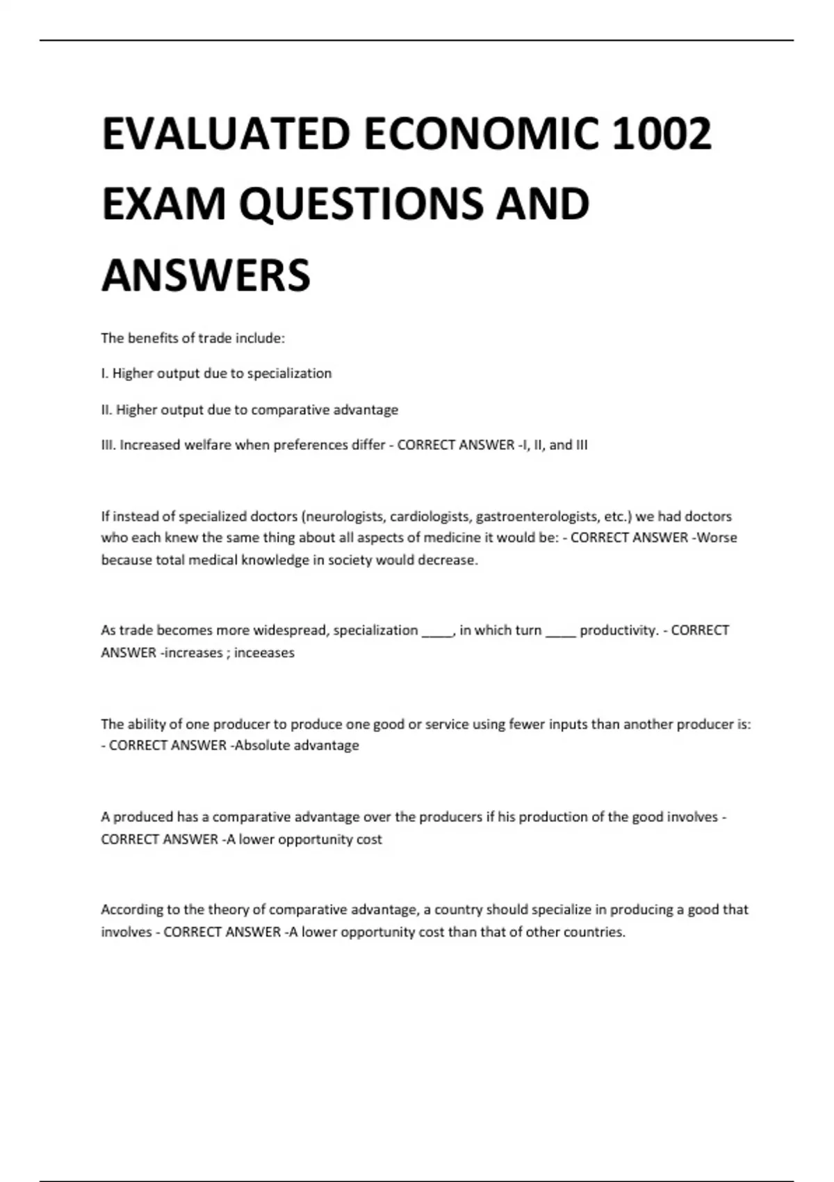 EVALUATED ECONOMIC 1002 EXAM QUESTIONS AND ANSWERS The benefits of trade include: I. Higher output due to specialization II. Higher output due to comparative advantage III. Increased welfare when preferences differ - CORRECT ANSWER -I, II, and III If instead of specialized doctors (neurologists, cardiologists, gastroenterologists, etc.) we had doctors who each knew the same thing about all aspects of medicine it would be: - CORRECT ANSWER -Worse because total medical knowledge in society would decrease. As trade becomes more widespread, specialization ____, in which turn ____ productivity. - CORRECT ANSWER -increases ; inceeases The ability of one producer to produce one good or service using fewer inputs than another producer is: - CORRECT ANSWER -Absolute advantage A produced has a comparative advantage over the producers if his production of the good involves - CORRECT ANSWER -A lower opportunity cost According to the theory of comparative advantage, a country should specialize in producing a good that involves - CORRECT ANSWER -A lower opportunity cost than that of other countries. The real cost of producing a good is: - CORRECT ANSWER -The opportunity cost of producing the good Figure: PFF Goods X & Y) Refer to the figure. Which of the points representing various consumption possibilities for the country portrayed above is only attainable through foreign trade? - CORRECT ANSWER -Point C (Figure: PFF Nickel & Textiles) Refer to the figure. What is the maximum amount of textiles China can produce? - CORRECT ANSWER -8 tons (Figure: PFF Nickel & Textiles) Refer to the figure. How many tons of text tiles does Australia give up to produce one ton of nickel - CORRECT ANSWER -1/3 (Table: Iphone and Ipod Production) According to the table on iPhone and iPod Production, which of the following is TRUE? - CORRECT ANSWER -The United States has an absolute advantage in producing both Iphones and Ipods. (Table: Iphone and Ipod Production) According to the table on iPhone and iPod Production, the opportunity cost of production one iPhone is: - CORRECT ANSWER -3/4 of one iPod for Canada, and one iPod for the United States. (Table: iPhone and iPod Production) According to the table on iPhone and iPod Production, which of the following is TRUE about Canadian and U.S. comparative advantages? - CORRECT ANSWER -Canada has a comparative advantage in producing iPhones, and the United States has a comparative advantage in producing iPods. (A) Anita is a wonderful baker and can bake 10 cakes in a day, but then has no time left to make cookies. If she bakes only cookies, she can make 200 cookies in a day. John can make equally delicious cakes and cookies but can only make seven cakes or 100 cookies in a day. Based on this information, which of the following statements is true? - CORRECT ANSWER -John has the comparative advantage in the production of cakes.