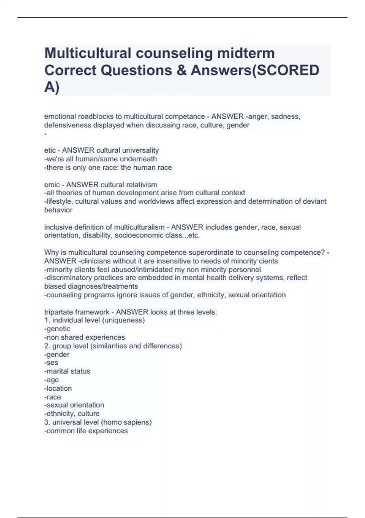 Multicultural counseling midterm Correct Questions & Answers(SCORED A)