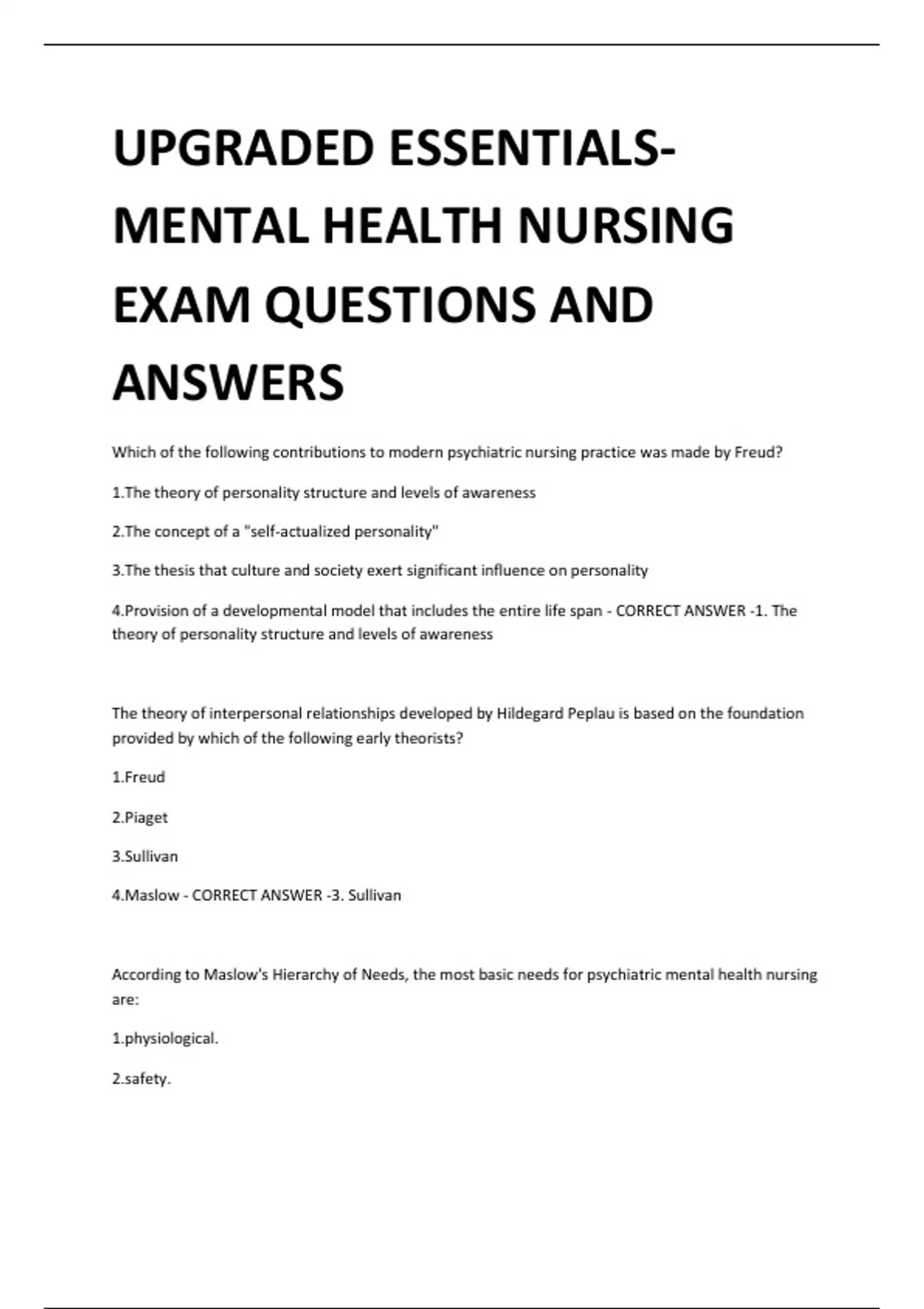 UPGRADED ESSENTIALSMENTAL HEALTH NURSING EXAM QUESTIONS AND ANSWERS Which of the following contributions to modern psychiatric nursing practice was made by Freud? 1.The theory of personality structure and levels of awareness 2.The concept of a "self-actualized personality" 3.The thesis that culture and society exert significant influence on personality 4.Provision of a developmental model that includes the entire life span - CORRECT ANSWER -1. The theory of personality structure and levels of awareness The theory of interpersonal relationships developed by Hildegard Peplau is based on the foundation provided by which of the following early theorists? 1.Freud 2.Piaget 3.Sullivan 4.Maslow - CORRECT ANSWER -3. Sullivan According to Maslow's Hierarchy of Needs, the most basic needs for psychiatric mental health nursing are: ological. y. and belonging. -actualization. - CORRECT ANSWER -1. physiological. The premise that an individual's behavior and affect are largely determined by the attitudes and assumptions the person has developed about the world underlies: ing. u therapy. tive behavioral therapy. oanalytic psychotherapy. - CORRECT ANSWER -3. cognitive behavioral therapy. Providing a safe environment for patients with impaired cognition, referring an abused spouse to a "safe house," and conducting a community meeting are nursing interventions that address aspects of: u therapy. tive therapy. ioral therapy. personal psychotherapy. - CORRECT ANSWER -1. Milieu therapy. The "art" of psychiatric mental health nursing, according to Benner, includes: (select all that apply) g. ding. nt advocacy. s. - CORRECT ANSWER -g. ding. nt advocacy.