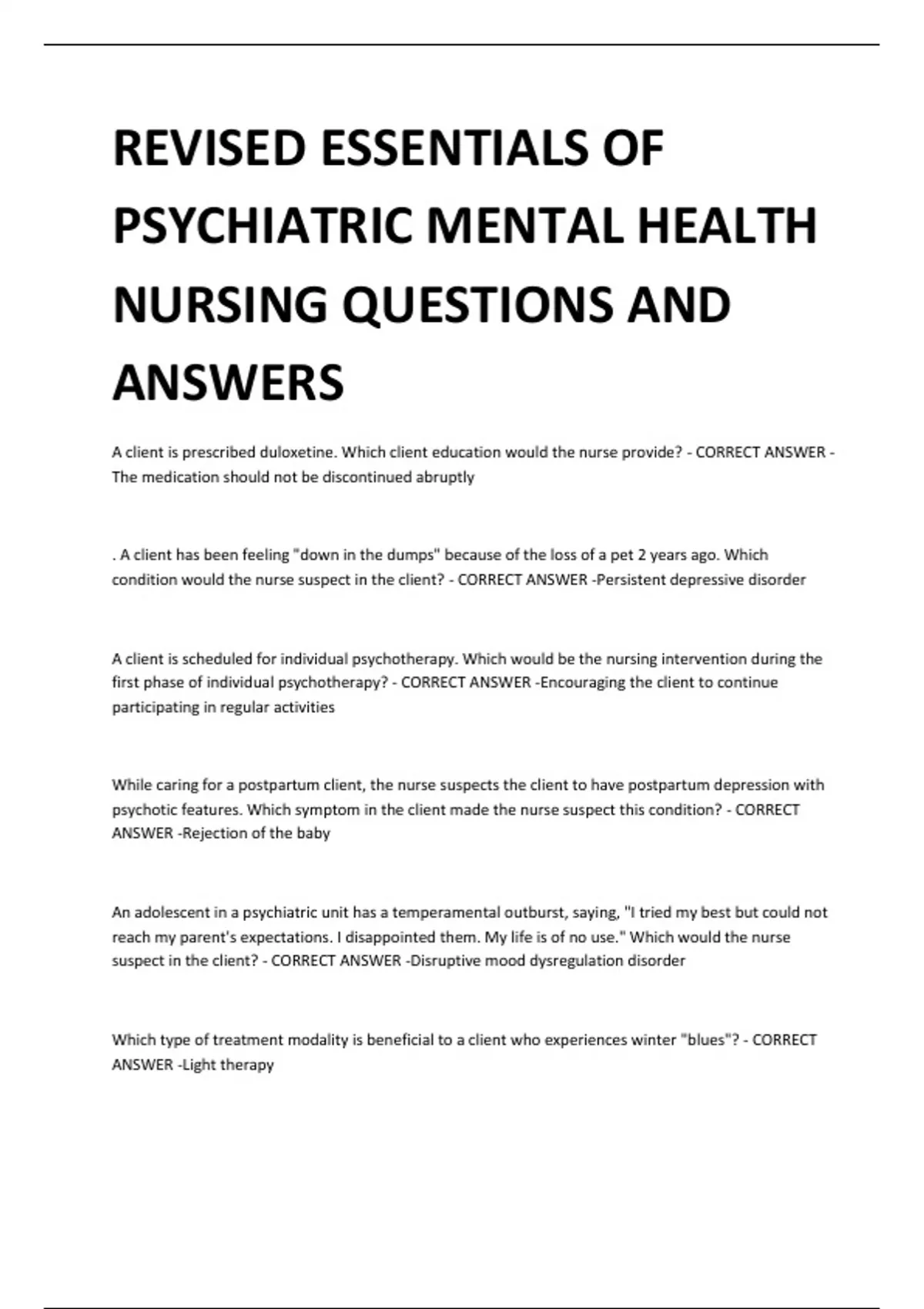 REVISED ESSENTIALS OF PSYCHIATRIC MENTAL HEALTH NURSING QUESTIONS AND ANSWERS A client is prescribed duloxetine. Which client education would the nurse provide? - CORRECT ANSWER The medication should not be discontinued abruptly . A client has been feeling "down in the dumps" because of the loss of a pet 2 years ago. Which condition would the nurse suspect in the client? - CORRECT ANSWER -Persistent depressive disorder A client is scheduled for individual psychotherapy. Which would be the nursing intervention during the first phase of individual psychotherapy? - CORRECT ANSWER -Encouraging the client to continue participating in regular activities While caring for a postpartum client, the nurse suspects the client to have postpartum depression with psychotic features. Which symptom in the client made the nurse suspect this condition? - CORRECT ANSWER -Rejection of the baby An adolescent in a psychiatric unit has a temperamental outburst, saying, "I tried my best but could not reach my parent's expectations. I disappointed them. My life is of no use." Which would the nurse suspect in the client? - CORRECT ANSWER -Disruptive mood dysregulation disorder Which type of treatment modality is beneficial to a client who experiences winter "blues"? - CORRECT ANSWER -Light therapy The primary health-care provider suggests that the nurse schedule light therapy for a client early in the day. Which complication can be prevented in the client as a result of this intervention? - CORRECT ANSWER -Insomnia A nurse, while preparing a client for electroconvulsive therapy (ECT), administers a muscle relaxant. Which further care would the nurse provide to ensure safety during the therapy? - CORRECT ANSWER Oxygenate the client during the treatment. A nurse, on reviewing the prescription of a client with depression, informs the client to chew sugarless candies occasionally. Which complication can be relieved in the client by implementing the nurse's suggestion? - CORRECT ANSWER -Dry mouth Antidepressant drugs usually cause dry mouth as a complication. The client is advised to chew sugarless candies to prevent dry mouth. The nurse reviews the prescription of a client with depression and informs the client, "You should make sure you slowly rise up from the sitting or lying down position." Which is the nurse expecting to control in the client? - CORRECT ANSWER -*Variation in blood pressure The nurse informs the client on antidepressant therapy to rise slowly from the sitting or lying position to prevent orthostatic hypotension. Orthostatic hypotension refers to a drop in blood pressure when the client rises from a sitting or lying position. How does electroconvulsive therapy (ECT) work to treat a depressed client? - CORRECT ANSWER -*ECT increases serotonin levels. The electrical stimulation of ECT causes significant increase in neurotransmitter levels. This increases serotonin levels.
