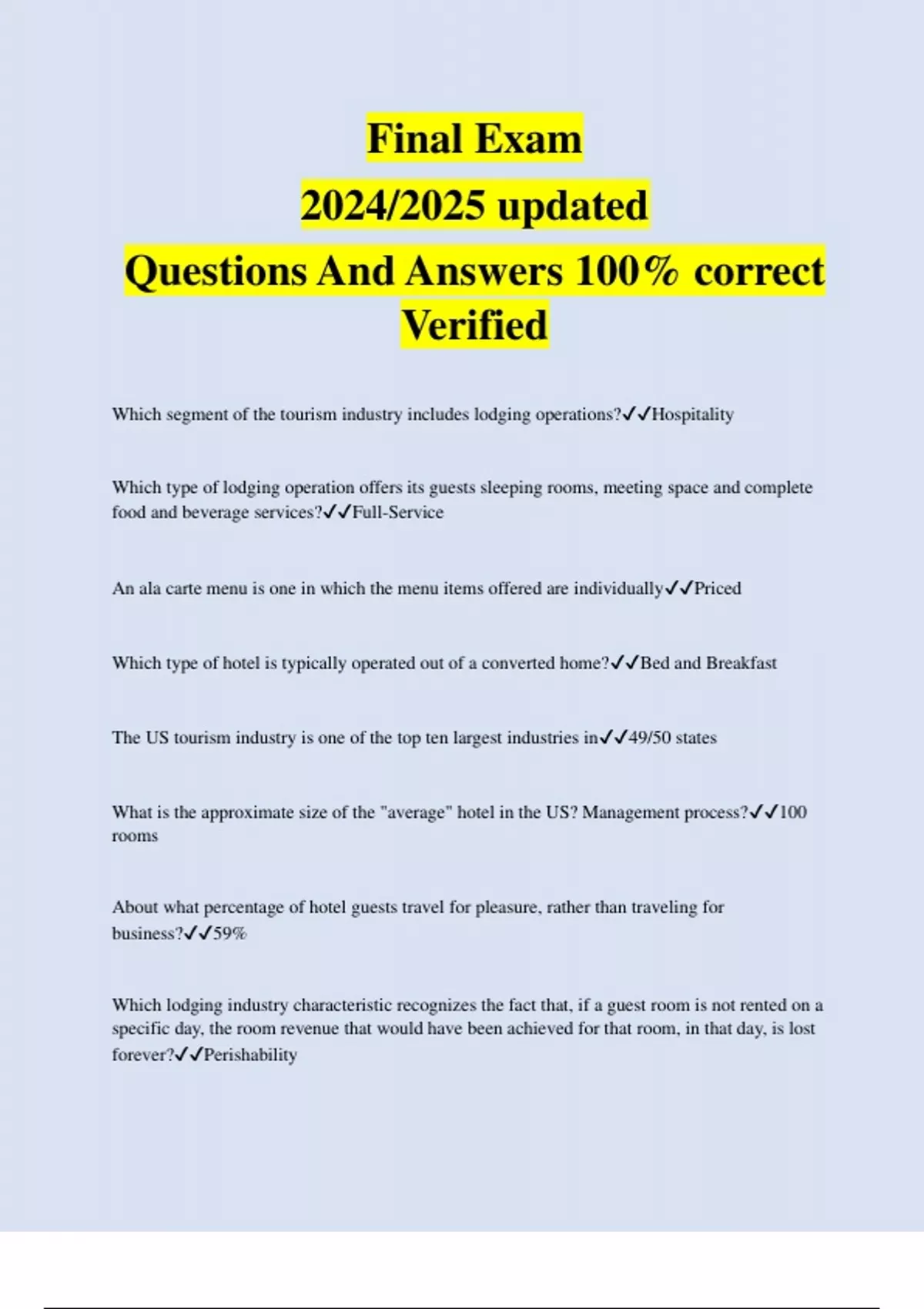 Which segment of the tourism industry includes lodging operations?Hospitality Which type of lodging operation offers its guests sleeping rooms, meeting space and complete food and beverage services?Full-Service An ala carte menu is one in which the menu items offered are individuallyPriced Which type of hotel is typically operated out of a converted home?Bed and Breakfast The US tourism industry is one of the top ten largest industries in49/50 states What is the approximate size of the "average" hotel in the US? Management process?100 rooms About what percentage of hotel guests travel for pleasure, rather than traveling for business?59% Which lodging industry characteristic recognizes the fact that, if a guest room is not rented on a specific day, the room revenue that would have been achieved for that room, in that day, is lost forever?Perishability