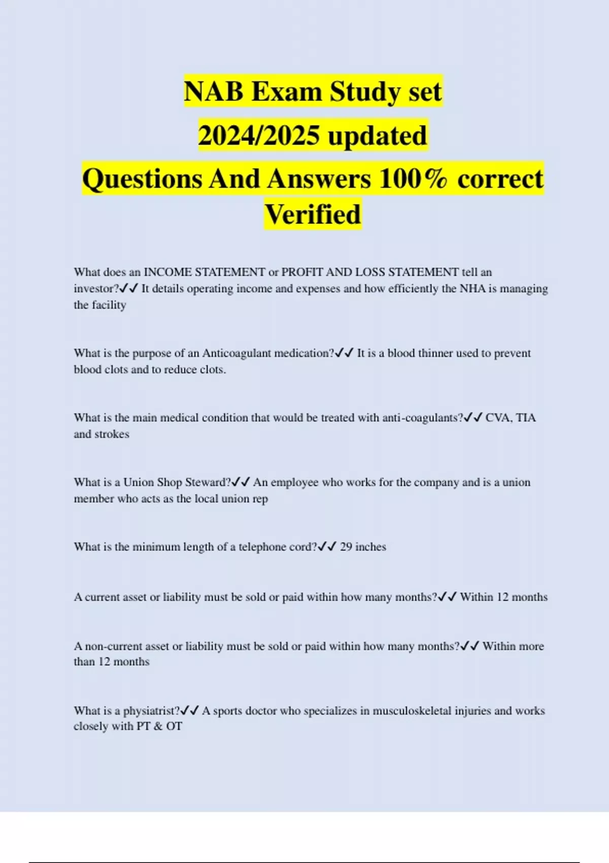 What does an INCOME STATEMENT or PROFIT AND LOSS STATEMENT tell an investor? It details operating income and expenses and how efficiently the NHA is managing the facility What is the purpose of an Anticoagulant medication? It is a blood thinner used to prevent blood clots and to reduce clots. What is the main medical condition that would be treated with anti-coagulants? CVA, TIA and strokes What is a Union Shop Steward? An employee who works for the company and is a union member who acts as the local union rep What is the minimum length of a telephone cord? 29 inches A current asset or liability must be sold or paid within how many months? Within 12 months A non-current asset or liability must be sold or paid within how many months? Within more than 12 months What is a physiatrist? A sports doctor who specializes in musculoskeletal injuries and works closely with PT & OT