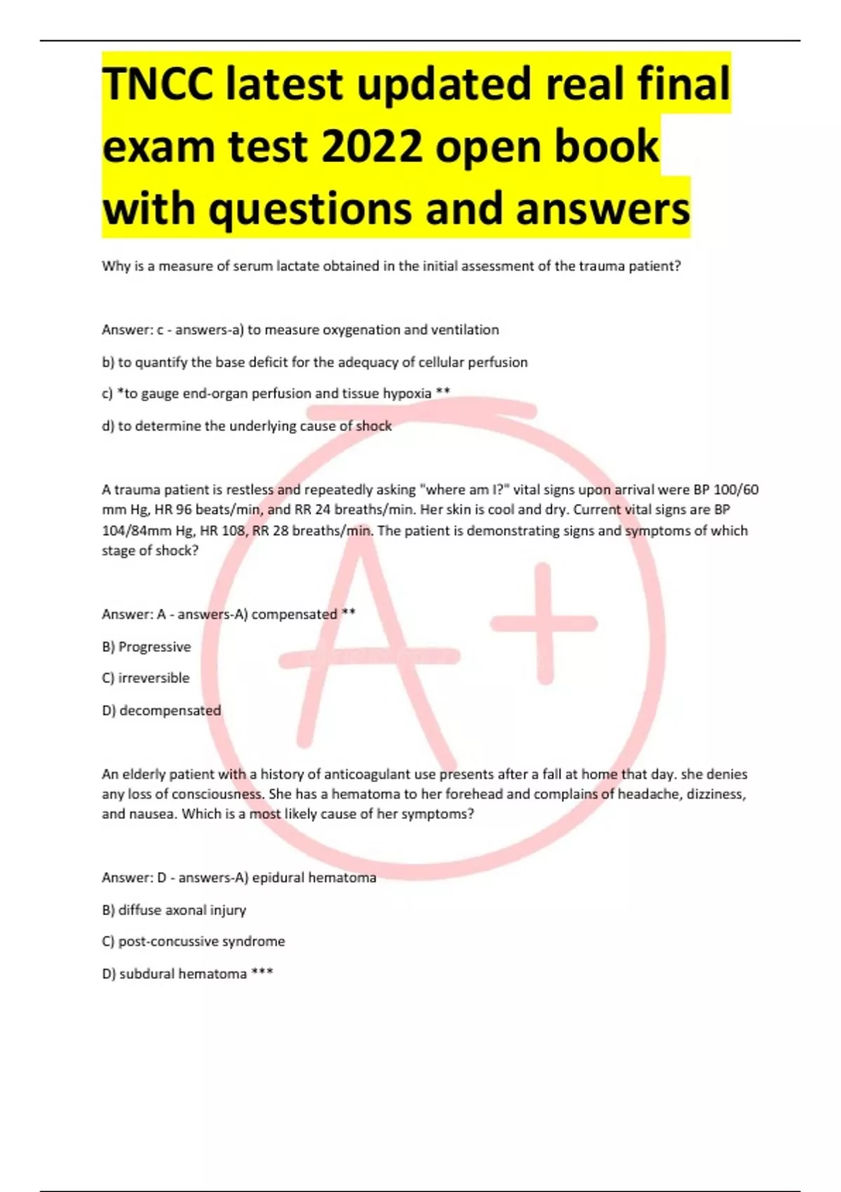 TNCC latest updated real final exam test 2022 open book with questions and answers