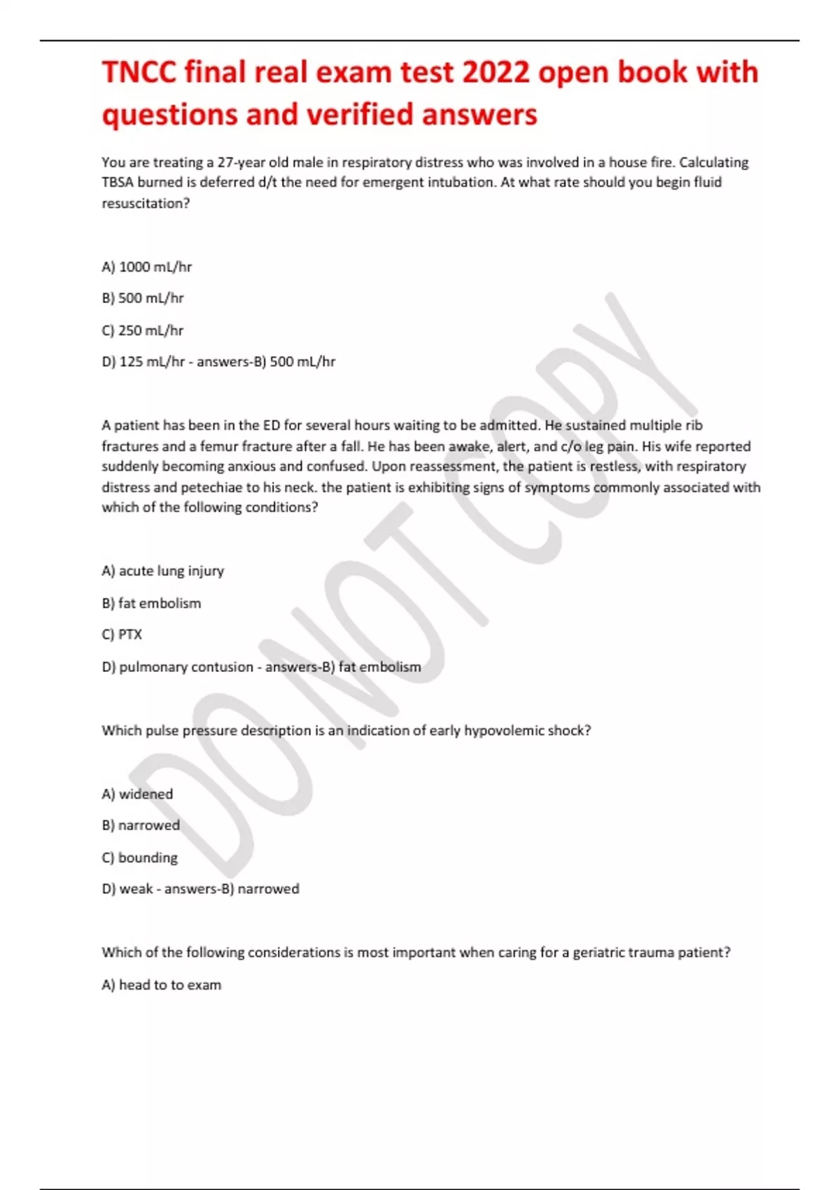You are treating a 27-year old male in respiratory distress who was involved in a house fire. Calculating TBSA burned is deferred d/t the need for emergent intubation. At what rate should you begin fluid resuscitation? A) 1000 mL/hr B) 500 mL/hr C) 250 mL/hr D) 125 mL/hr - answers-B) 500 mL/hr A patient has been in the ED for several hours waiting to be admitted. He sustained multiple rib fractures and a femur fracture after a fall. He has been awake, alert, and c/o leg pain. His wife reported suddenly becoming anxious and confused. Upon reassessment, the patient is restless, with respiratory distress and petechiae to his neck. the patient is exhibiting signs of symptoms commonly associated with which of the following conditions? A) acute lung injury B) fat embolism C) PTX D) pulmonary contusion - answers-B) fat embolism Which pulse pressure description is an indication of early hypovolemic shock? A) widened B) narrowed C) bounding D) weak - answers-B) narrowed Which of the following considerations is most important when caring for a geriatric trauma patient? A