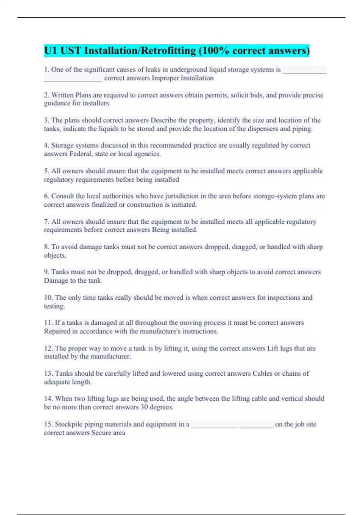 1. One of the significant causes of leaks in underground liquid storage systems is ____________ ________________ correct answers Improper Installation 2. Written Plans are required to correct answers obtain permits, solicit bids, and provide precise guidance for installers. 3. The plans should correct answers Describe the property, identify the size and location of the tanks, indicate the liquids to be stored and provide the location of the dispensers and piping. 4. Storage systems discussed in this recommended practice are usually regulated by correct answers Federal, state or local agencies. 5. All owners should ensure that the equipment to be installed meets correct answers applicable regulatory requirements before being installed 6. Consult the local authorities who have jurisdiction in the area before storage-system plans are correct answers finalized or construction is initiated. 7. All owners should ensure that the equipment to be installed meets all applicable regulatory requirements before correct answers Being installed. 8. To avoid damage tanks must not be correct answers dropped, dragged, or handled with sharp objects. 9. Tanks must not be dropped, dragged, or handled with sharp objects to avoid correct answers Damage to the tank 10. The only time tanks really should be moved is when correct answers for inspections and testing. 11. If a tanks is damaged at all throughout the moving process it must be correct answers Repaired in accordance with the manufacture's instructions. 12. The proper way to move a tank is by lifting it, using the correct answers Lift lugs that are installed by the manufacturer. 13. Tanks should be carefully lifted and lowered using correct answers Cables or chains of adequate length. 14. When two lifting lugs are being used, the angle between the lifting cable and vertical should be no more than correct answers 30 degrees. 15. Stockpile piping materials and equipment in a _____________ _________ on the job site correct answers Secure area