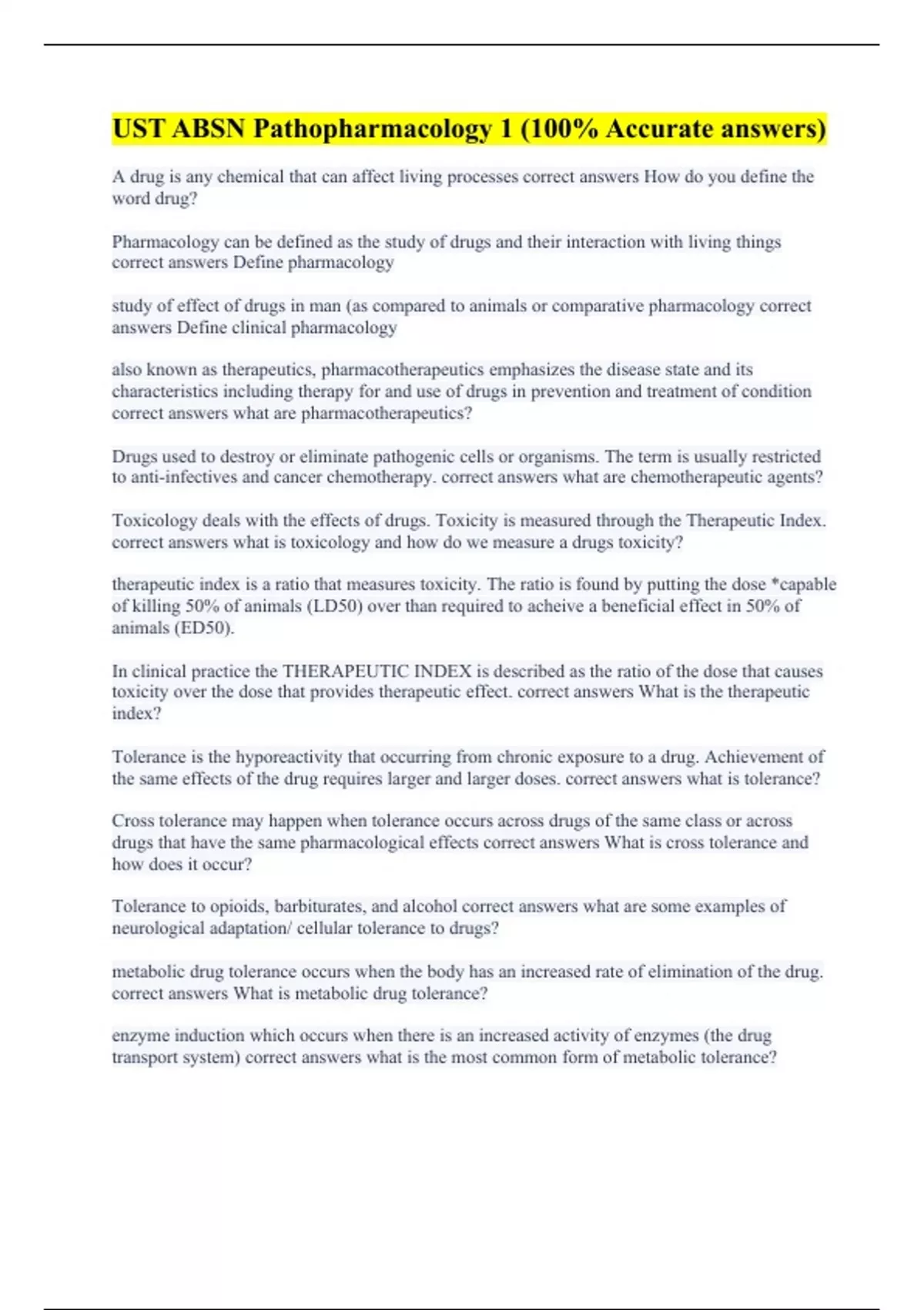 A drug is any chemical that can affect living processes correct answers How do you define the word drug? Pharmacology can be defined as the study of drugs and their interaction with living things correct answers Define pharmacology study of effect of drugs in man (as compared to animals or comparative pharmacology correct answers Define clinical pharmacology also known as therapeutics, pharmacotherapeutics emphasizes the disease state and its characteristics including therapy for and use of drugs in prevention and treatment of condition correct answers what are pharmacotherapeutics? Drugs used to destroy or eliminate pathogenic cells or organisms. The term is usually restricted to anti-infectives and cancer chemotherapy. correct answers what are chemotherapeutic agents? Toxicology deals with the effects of drugs. Toxicity is measured through the Therapeutic Index. correct answers what is toxicology and how do we measure a drugs toxicity? therapeutic index is a ratio that measures toxicity. The ratio is found by putting the dose *capable of killing 50% of animals (LD50) over than required to acheive a beneficial effect in 50% of animals (ED50). In clinical practice the THERAPEUTIC INDEX is described as the ratio of the dose that causes toxicity over the dose that provides therapeutic effect. correct answers What is the therapeutic index? Tolerance is the hyporeactivity that occurring from chronic exposure to a drug. Achievement of the same effects of the drug requires larger and larger doses. correct answers what is tolerance? Cross tolerance may happen when tolerance occurs across drugs of the same class or across drugs that have the same pharmacological effects correct answers What is cross tolerance and how does it occur? Tolerance to opioids, barbiturates, and alcohol correct answers what are some examples of neurological adaptation/ cellular tolerance to drugs? metabolic drug tolerance occurs when the body has an increased rate of elimination of the drug. correct answers What is metabolic drug tolerance? enzyme induction which occurs when there is an increased activity of enzymes (the drug transport system) correct answers what is the most common form of metabolic tolerance?