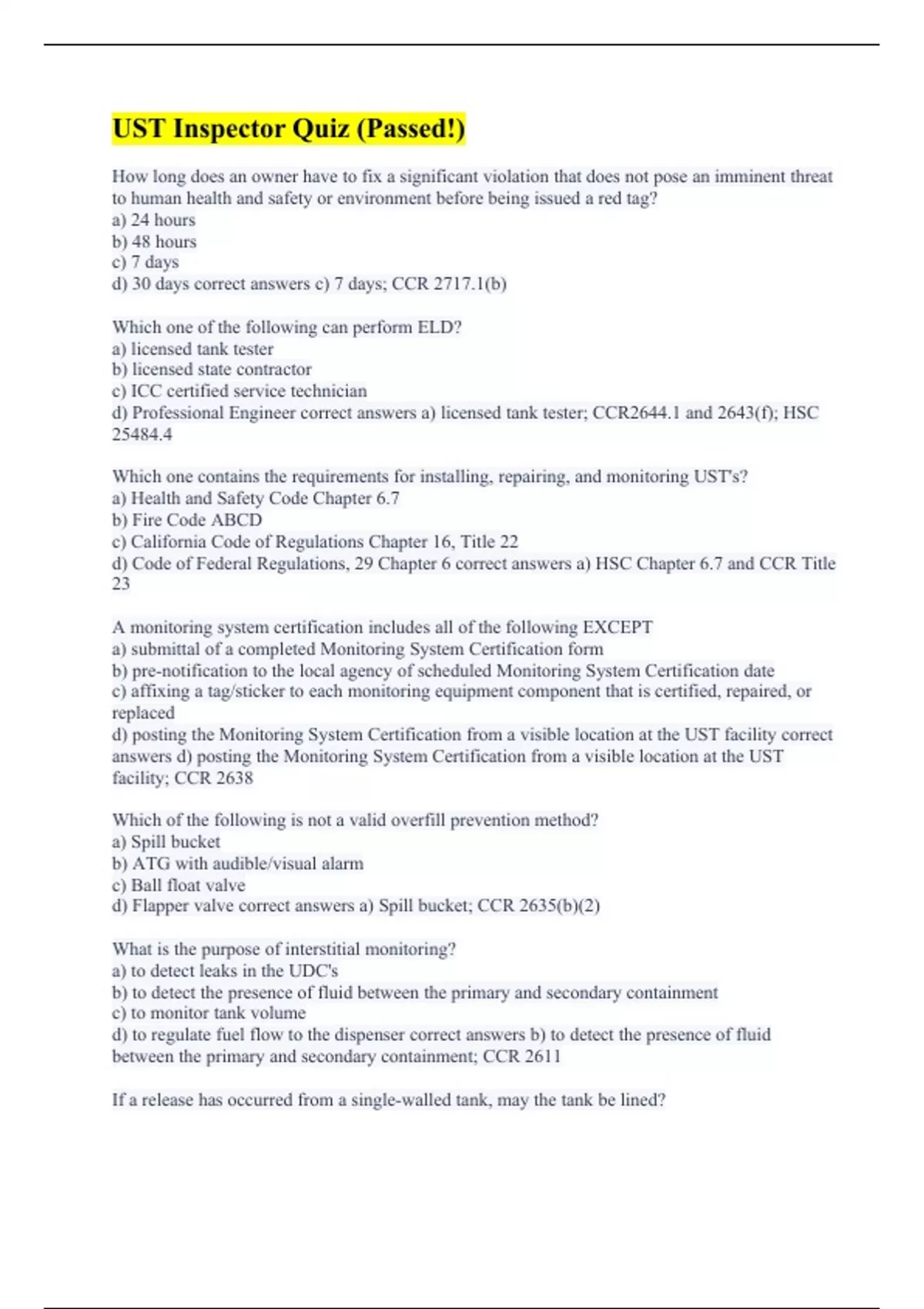 How long does an owner have to fix a significant violation that does not pose an imminent threat to human health and safety or environment before being issued a red tag? a) 24 hours b) 48 hours c) 7 days d) 30 days correct answers c) 7 days; CCR 2717.1(b) Which one of the following can perform ELD? a) licensed tank tester b) licensed state contractor c) ICC certified service technician d) Professional Engineer correct answers a) licensed tank tester; CCR2644.1 and 2643(f); HSC 25484.4 Which one contains the requirements for installing, repairing, and monitoring UST's? a) Health and Safety Code Chapter 6.7 b) Fire Code ABCD c) California Code of Regulations Chapter 16, Title 22 d) Code of Federal Regulations, 29 Chapter 6 correct answers a) HSC Chapter 6.7 and CCR Title 23 A monitoring system certification includes all of the following EXCEPT a) submittal of a completed Monitoring System Certification form b) pre-notification to the local agency of scheduled Monitoring System Certification date c) affixing a tag/sticker to each monitoring equipment component that is certified, repaired, or replaced d) posting the Monitoring System Certification from a visible location at the UST facility correct answers d) posting the Monitoring System Certification from a visible location at the UST facility; CCR 2638 Which of the following is not a valid overfill prevention method? a) Spill bucket b) ATG with audible/visual alarm c) Ball float valve d) Flapper valve correct answers a) Spill bucket; CCR 2635(b)(2) What is the purpose of interstitial monitoring? a) to detect leaks in the UDC's b) to detect the presence of fluid between the primary and secondary containment c) to monitor tank volume d) to regulate fuel flow to the dispenser correct answers b) to detect the presence of fluid between the primary and secondary containment; CCR 2611 If a release has occurred from a single-walled tank, may the tank be lined?