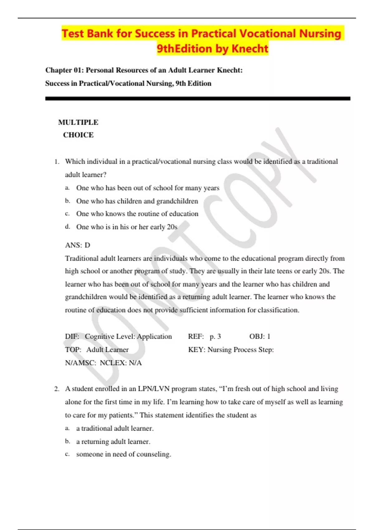 1. Which individual in a practical/vocational nursing class would be identified as a traditional adult learner? a. One who has been out of school for many years b. One who has children and grandchildren c. One who knows the routine of education d. One who is in his or her early 20s ANS: D Traditional adult learners are individuals who come to the educational program directly from high school or another program of study. They are usually in their late teens or early 20s. The learner who has been out of school for many years and the learner who has children and grandchildren would be identified as a returning adult learner. The learner who knows the routine of education does not provide sufficient information for classification. DIF: Cognitive Level: Application REF: p. 3 OBJ: 1 TOP: Adult Learner KEY: Nursing Process Step: N/A MSC: NCLEX: N/A 2. A student enrolled in an LPN/LVN program states, “I’m fresh out of high school and living alone for the first time in my life. I’m learning how to take care of myself as well as learning to care for my patients.” This statement identifies the student as a. a traditional adult learner. b. a returning adult learner. c. someone in need of counseling. d. someone who is not accustomed to formal education. ANS: A Traditional adult learners are individuals who are in their late teens or early 20s who have come to the practical/vocational program directly from high school or another program of study. A returning adult learner is someone who has been out of school for several years. A person in needed of counseling is commonly a student who has been evaluated by the instructor as having areas that need improvement. This student is a traditional adult learner, and traditional adult learners are accustomed to formal education. DIF: Cognitive Level: Analysis REF: p. 3 OBJ: 1 TOP: Adult Learner KEY: Nursing Process Step: N/A MSC: NCLEX: N/A 3. A nursing student states, “I have taken advantage of informal learning experiences.” Another student asks, “Could you give me an example?” The best example of an informal learning experience is a. caring for a disabled family member. b. taking a continuing education course. c. enrolling in an academic program. d. attending credit classes at the mall. ANS: A Informal learning experiences are those that take place outside a formal educational setting. A person who cares for a disabled family member would gain knowledge and skill in providing personal care. An education course, academic program, and credited classes all take place in a formal educational setting. DIF: Cognitive Level: Comprehension REF: p. 3 OBJ: 2 TOP: Informal educational experience KEY: Nursing Process Step: N/A MSC: NCLEX: N/A 4. What strategy can be used by a nursing student to effectively combat a fear of failure? a. Picture in your mind the rewards of succeeding b. Positive self-talk c. Create a mental script of positive thoughts d. All of the above ANS: D Picturing the rewards of succeeding, positive self-talk, and a mental script of positive thoughts all contribute a positive mental attitude and are all ways to combat the fear of failure. DIF: Cognitive Level: Comprehension REF: p. 4 OBJ: 2 TOP: Promoting success in the program of study KEY: Nursing Process Step: N/A MSC: NCLEX: N/A 5. An example of a self-talk “script” that promotes success in a practical/vocational nursing program is a. “I get sick from smelling