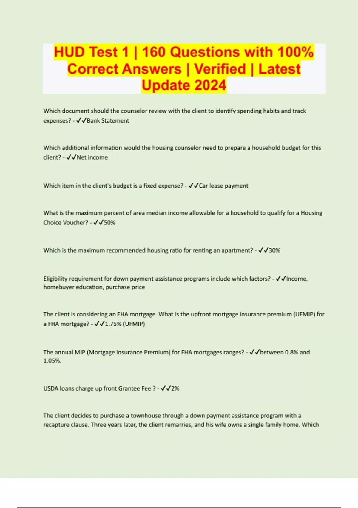 HUD Test 1 | 160 Questions with 100% Correct Answers | Verified | Latest Update 2024