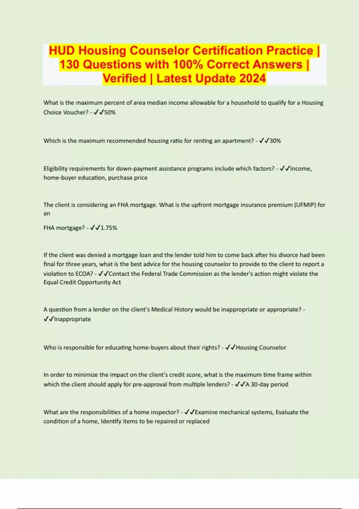 HUD Housing Counselor Certification Practice | 130 Questions with 100% Correct Answers | Verified | Latest Update 2024