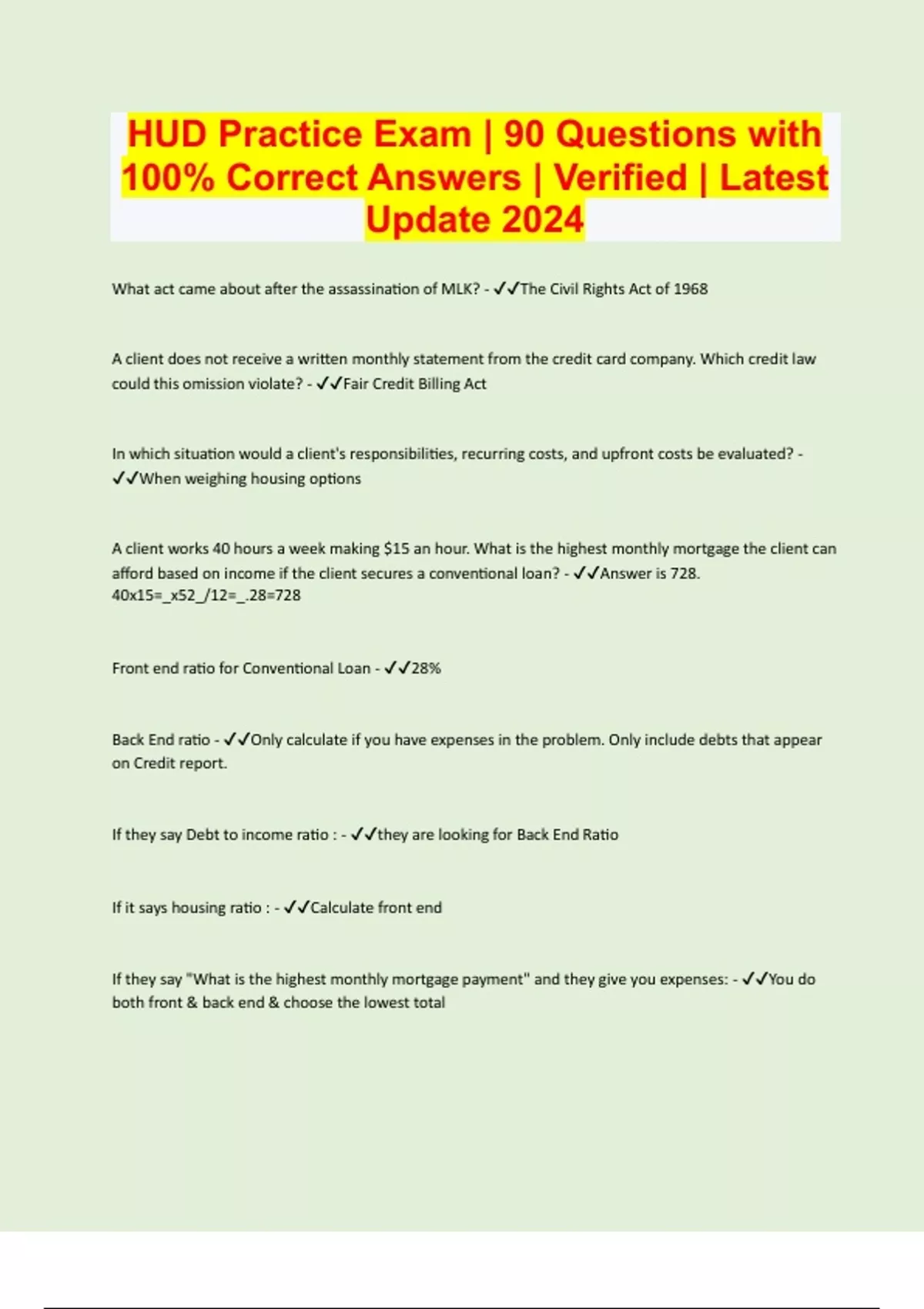 What act came about after the assassination of MLK? - The Civil Rights Act of 1968 A client does not receive a written monthly statement from the credit card company. Which credit law could this omission violate? - Fair Credit Billing Act In which situation would a client's responsibilities, recurring costs, and upfront costs be evaluated? - When weighing housing options A client works 40 hours a week making $15 an hour. What is the highest monthly mortgage the client can afford based on income if the client secures a conventional loan? - Answer is 728. 40x15=_x52_/12=_.28=728 Front end ratio for Conventional Loan - 28% Back End ratio - Only calculate if you have expenses in the problem. Only include debts that appear on Credit report. If they say Debt to income ratio : - they are looking for Back End Ratio