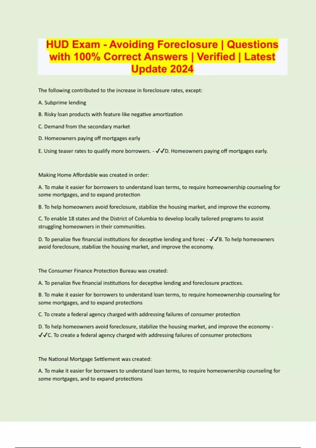 HUD Exam - Avoiding Foreclosure | Questions with 100% Correct Answers | Verified | Latest Update 2024