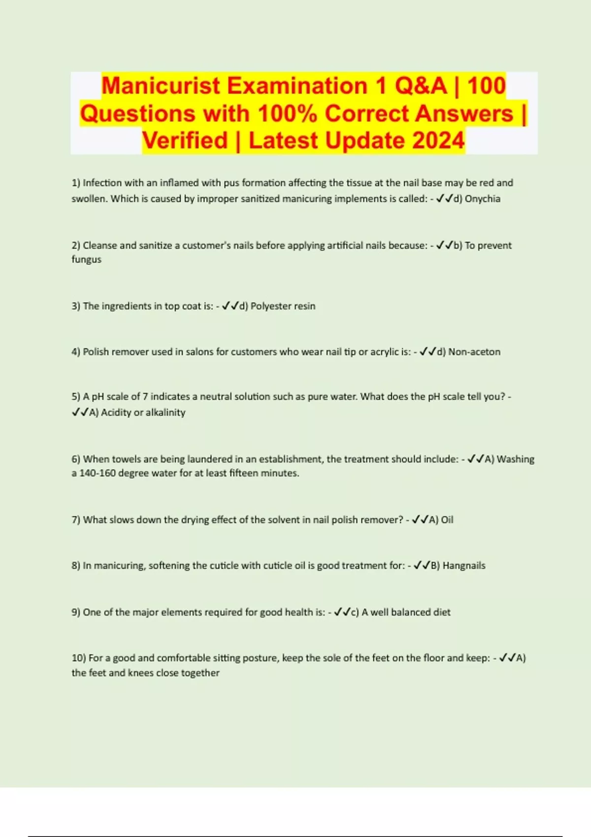 Manicurist Examination 1 Q&A | 100 Questions with 100% Correct Answers | Verified | Latest Update 2024