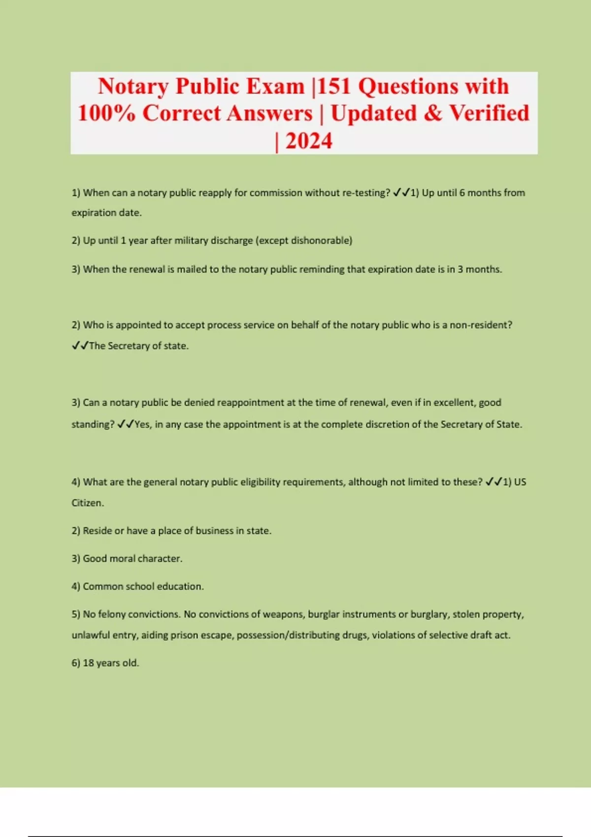 Notary Public Exam |151 Questions with 100% Correct Answers | Updated & Verified | 2024