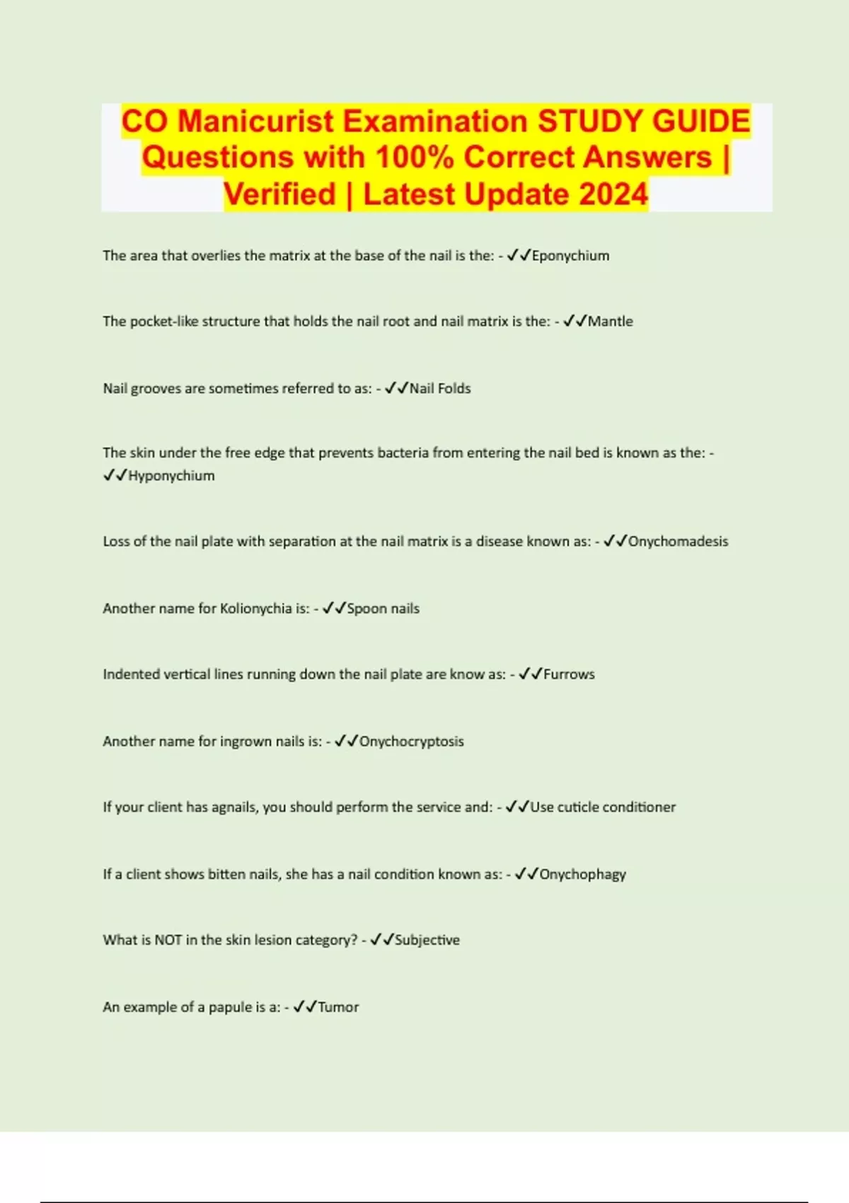CO Manicurist Examination STUDY GUIDE Questions with 100% Correct Answers | Verified | Latest Update 2024