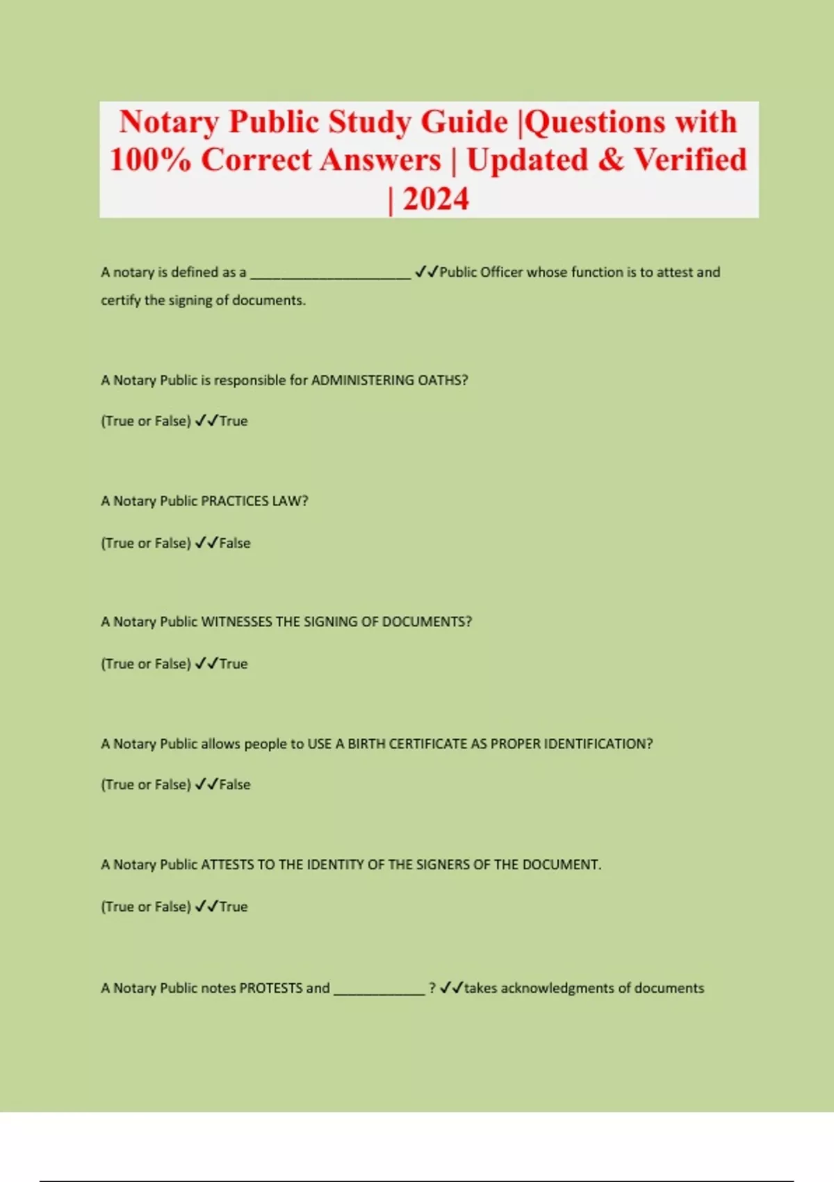 Notary Public Study Guide |Questions with 100% Correct Answers | Updated & Verified | 2024