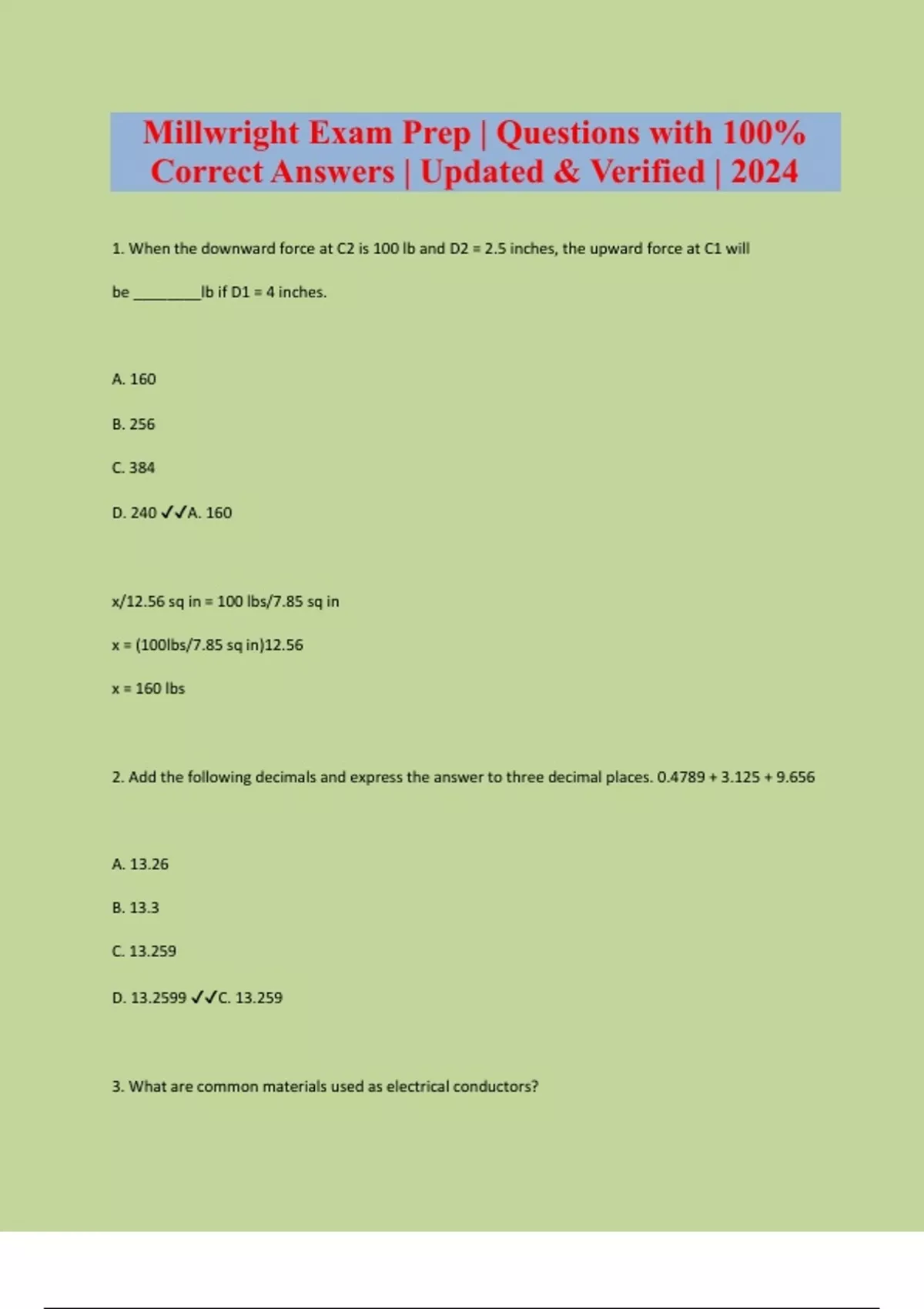 1. When the downward force at C2 is 100 lb and D2 = 2.5 inches, the upward force at C1 will be ________lb if D1 = 4 inches. A. 160 B. 256 C. 384 D. 240 A. 160 x/12.56 sq in = 100 lbs/7.85 sq in x = (100lbs/7.85 sq in)12.56 x = 160 lbs 2. Add the following decimals and express the answer to three decimal places. 0.4789 + 3.125 + 9.656 A. 13.26 B. 13.3 C. 13.259 D. 13.2599 C. 13.259