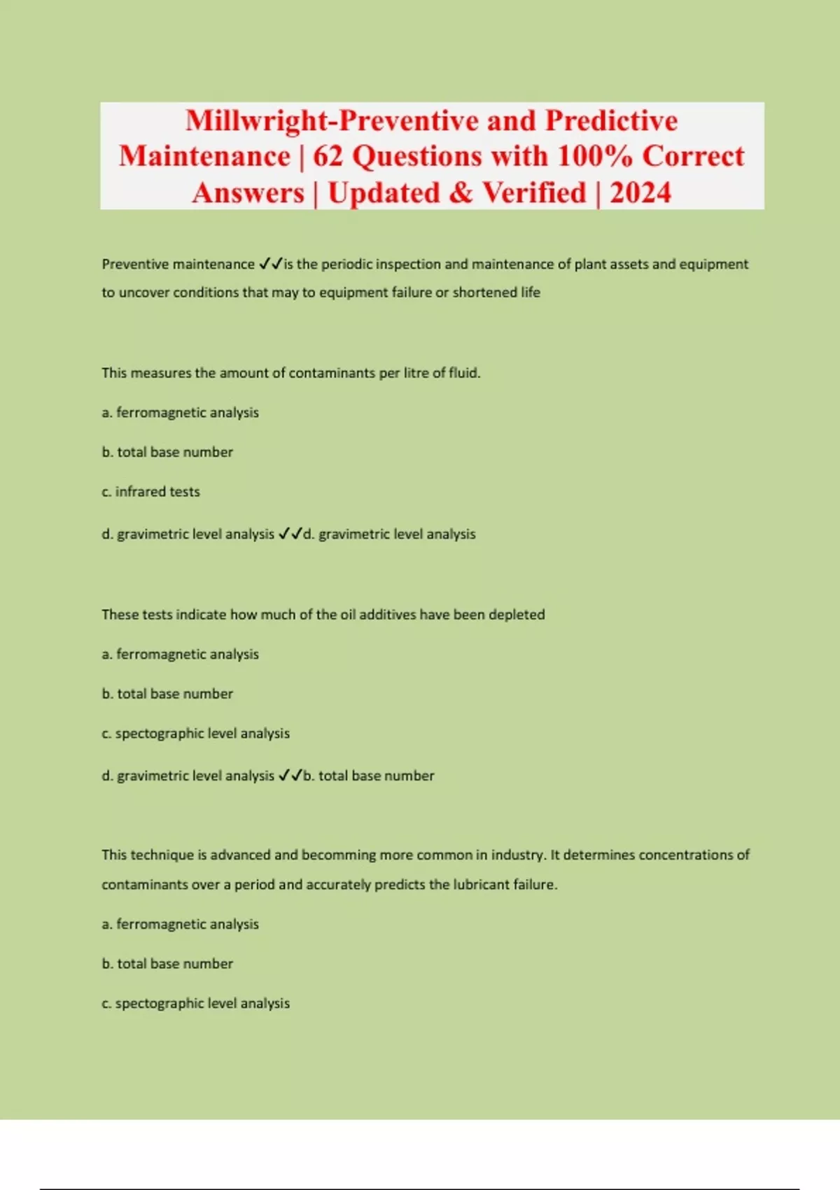 Millwright-Preventive and Predictive Maintenance | 62 Questions with 100% Correct Answers | Updated & Verified | 2024