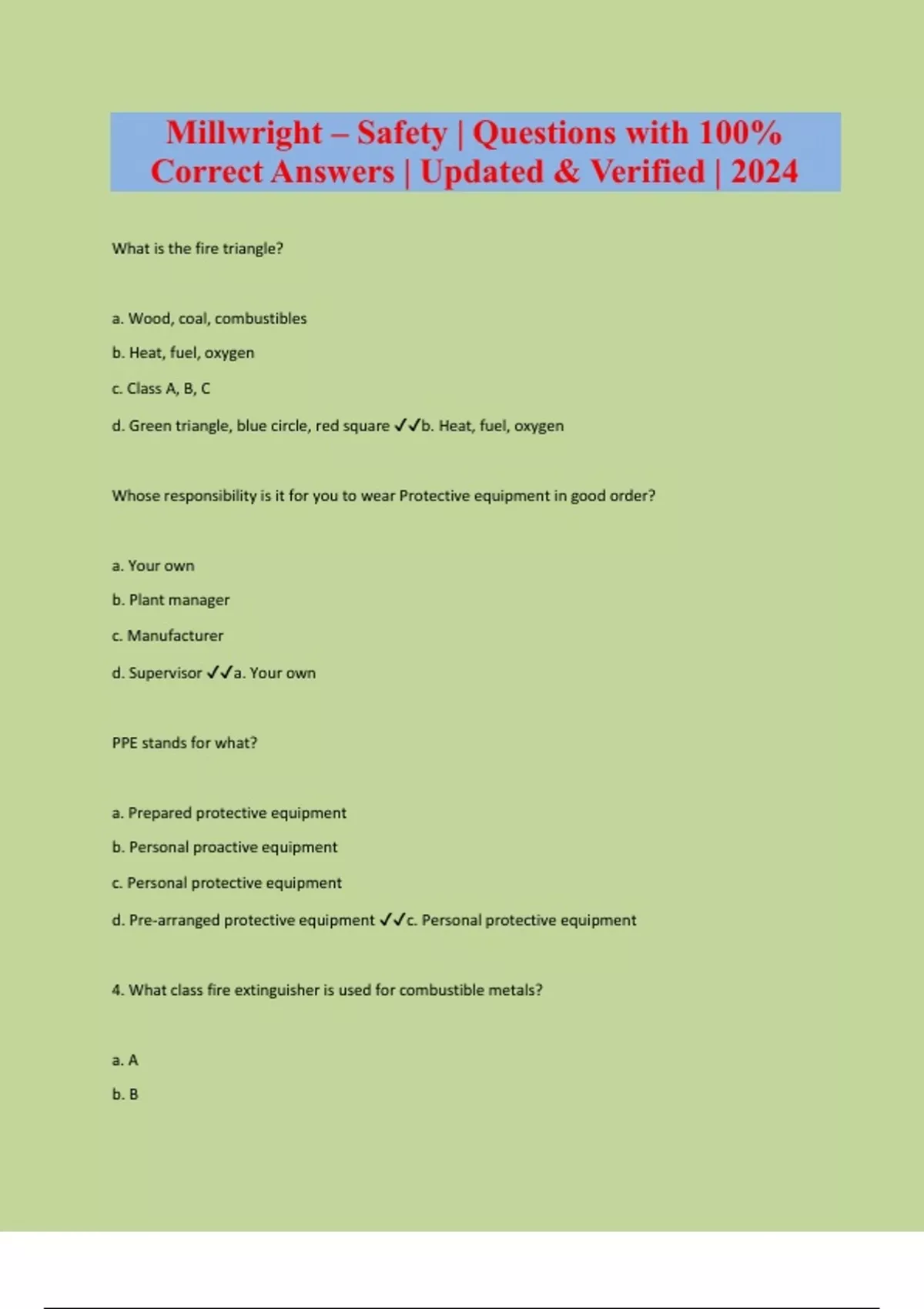 What is the fire triangle? a. Wood, coal, combustibles b. Heat, fuel, oxygen c. Class A, B, C d. Green triangle, blue circle, red square b. Heat, fuel, oxygen Whose responsibility is it for you to wear Protective equipment in good order? a. Your own b. Plant manager c. Manufacturer d. Supervisor a. Your own PPE stands for what? a. Prepared protective equipment b. Personal proactive equipment c. Personal protective equipment d. Pre-arranged protective equipment c. Personal protective equipment