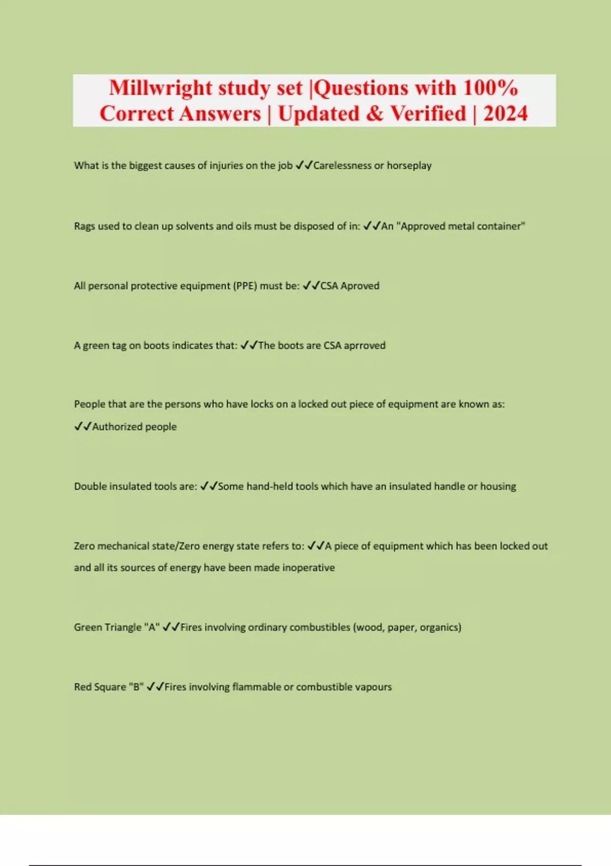 What is the biggest causes of injuries on the job Carelessness or horseplay Rags used to clean up solvents and oils must be disposed of in: An "Approved metal container" All personal protective equipment (PPE) must be: CSA Aproved A green tag on boots indicates that: The boots are CSA aprroved People that are the persons who have locks on a locked out piece of equipment are known as: Authorized people Double insulated tools are: Some hand-held tools which have an insulated handle or housing Zero mechanical state/Zero energy state refers to: A piece of equipment which has been locked out and all its sources of energy have been made inoperative Green Triangle "A" Fires involving ordinary combustibles (wood, paper, organics) Red Square "B" Fires involving flammable or combustible vapours