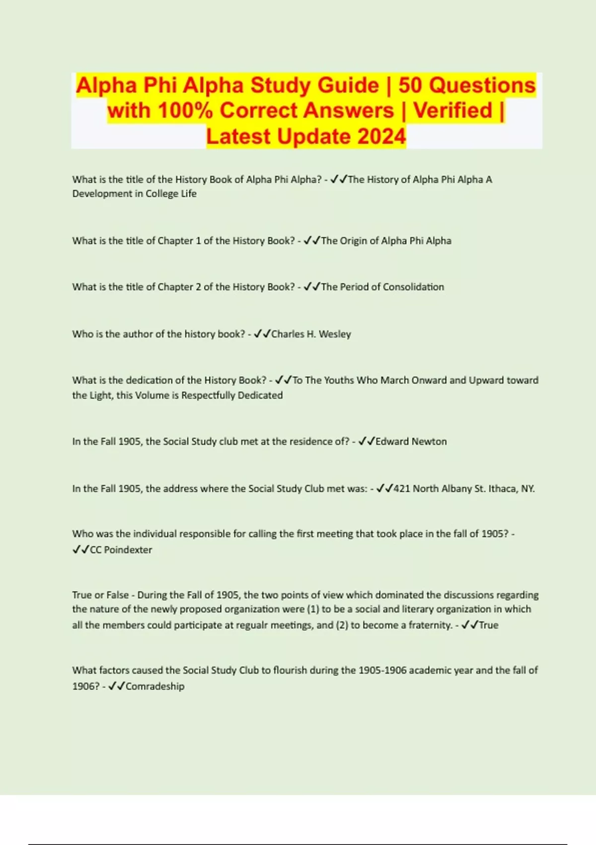 Alpha Phi Alpha Study Guide | 50 Questions with 100% Correct Answers | Verified | Latest Update 2024