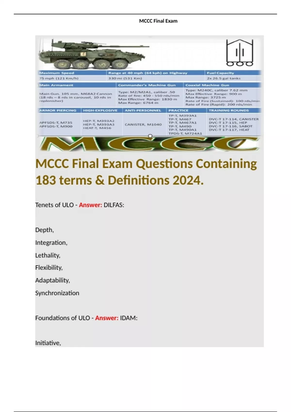 MCCC Final Exam Questions Containing 183 terms & Definitions 2024. Terms like: 1) Tenets of ULO - Answer: DILFAS: Depth, Integration, Lethality, Flexibility, Adaptability, Synchronization.