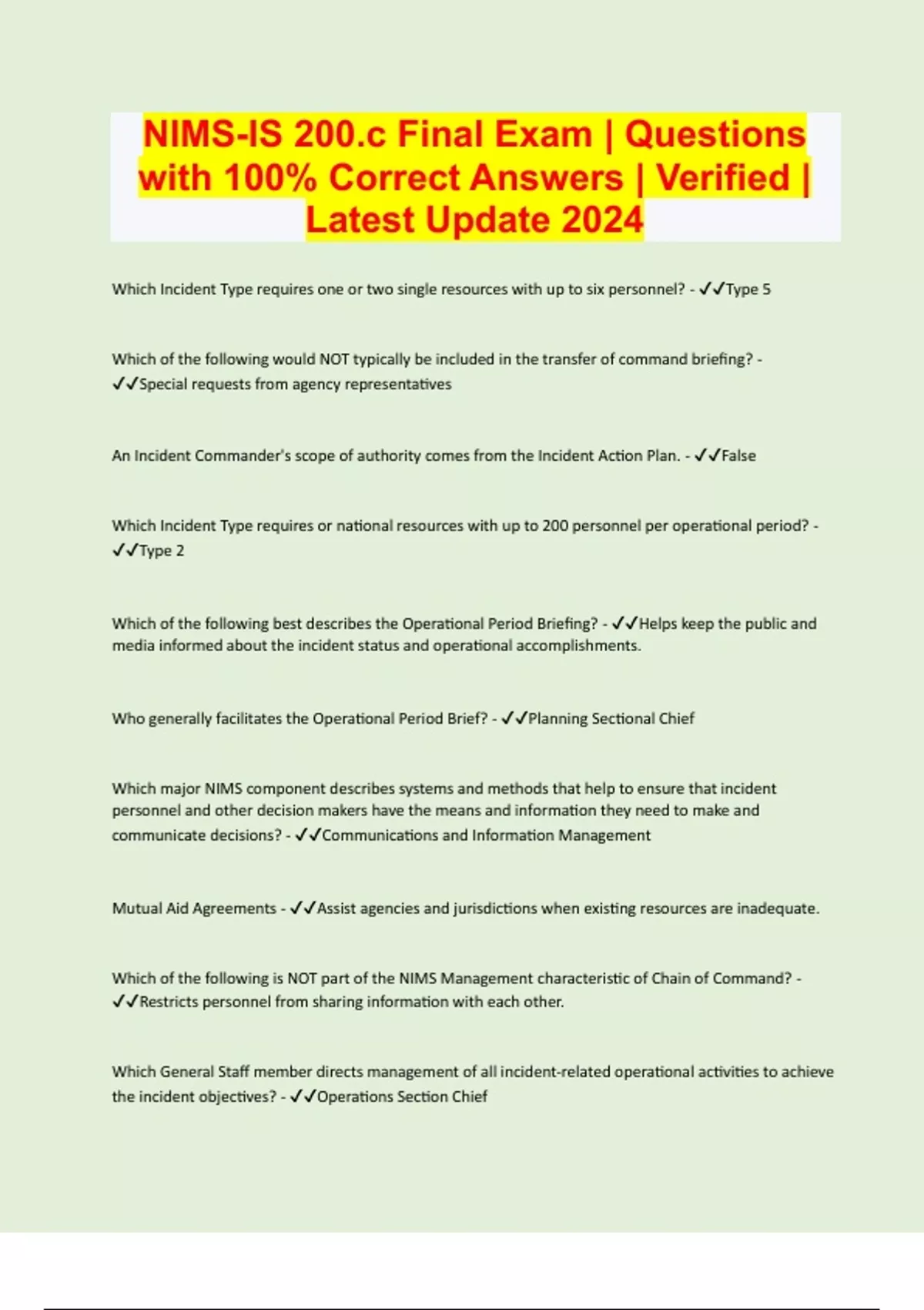 NIMS-IS 200.c Final Exam | Questions with 100% Correct Answers | Verified | Latest Update 2024