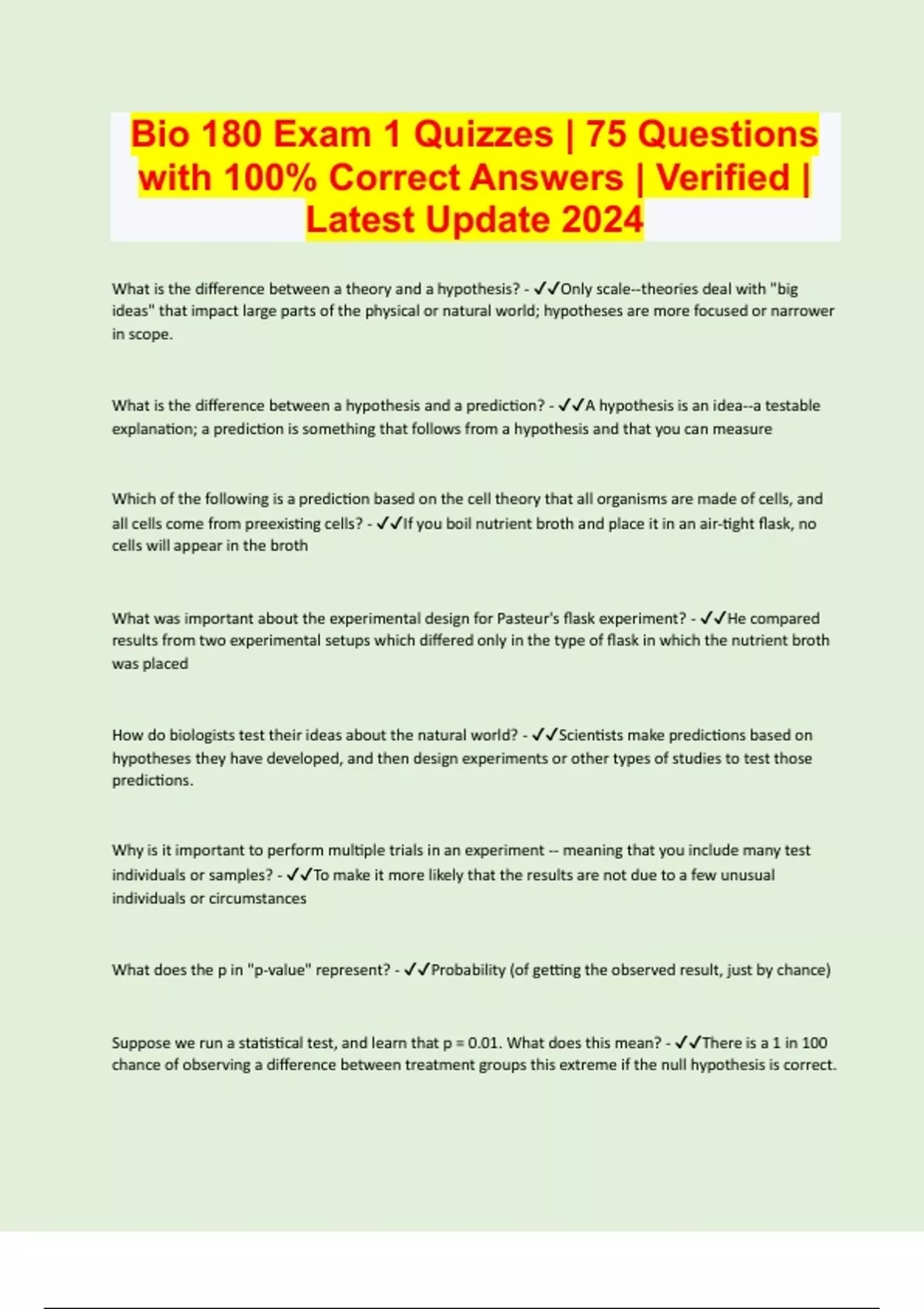 Bio 180 Exam 1 Quizzes | 75 Questions with 100% Correct Answers | Verified | Latest Update 2024