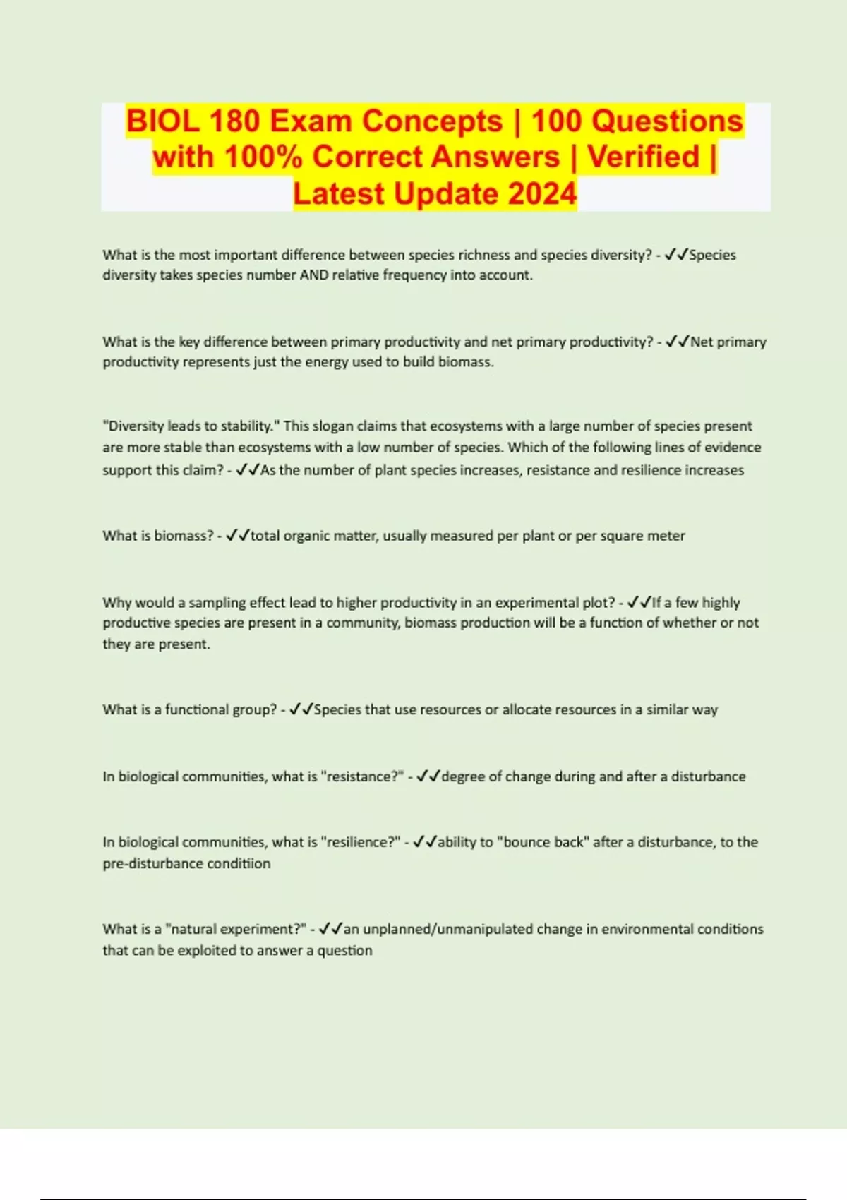 BIOL 180 Exam Concepts | 100 Questions with 100% Correct Answers | Verified | Latest Update 2024