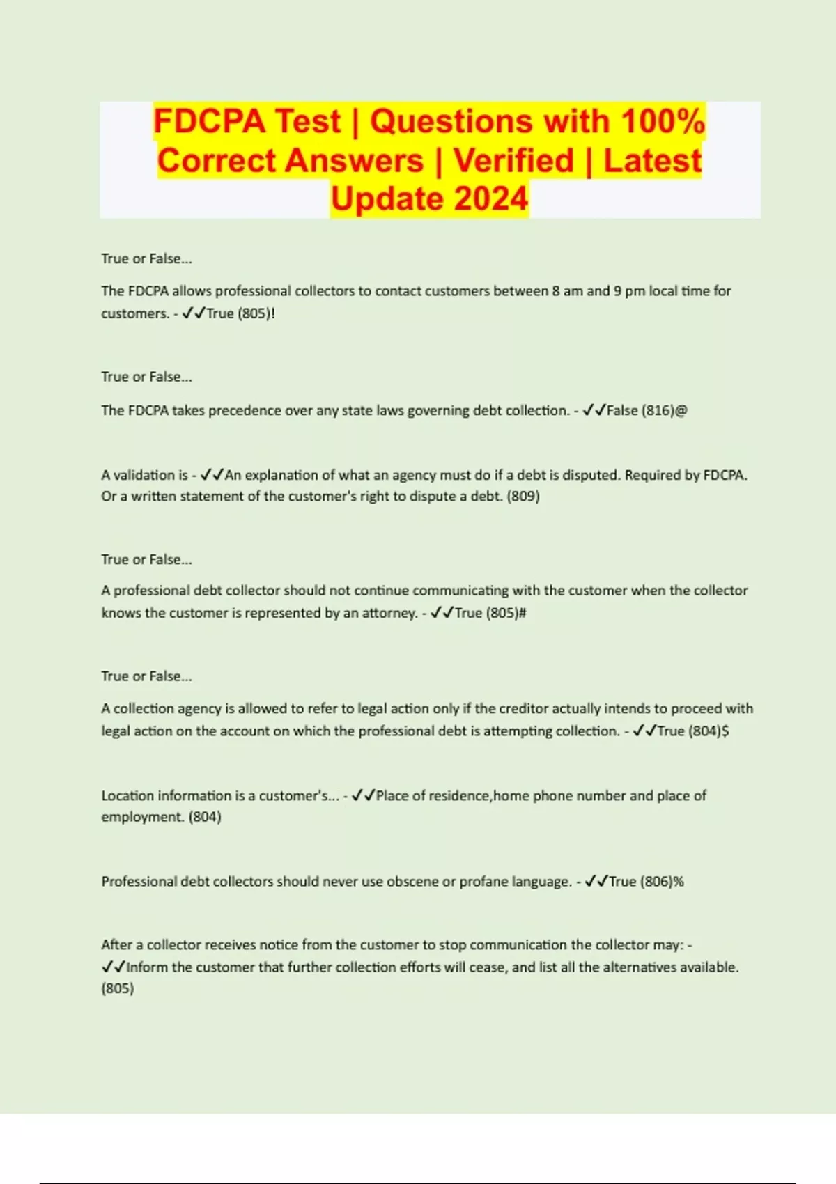 True or False... The FDCPA allows professional collectors to contact customers between 8 am and 9 pm local time for customers. - True (805)! True or False... The FDCPA takes precedence over any state laws governing debt collection. - False (816)@ A validation is - An explanation of what an agency must do if a debt is disputed. Required by FDCPA. Or a written statement of the customer's right to dispute a debt. (809) True or False... A professional debt collector should not continue communicating with the customer when the collector knows the customer is represented by an attorney. - True (805)# True or False... A collection agency is allowed to refer to legal action only if the creditor actually intends to proceed with legal action on the account on which the professional debt is attempting collection. - True (804)$ Location information is a customer's... - Place of residence,home phone number and place of employment. (804)