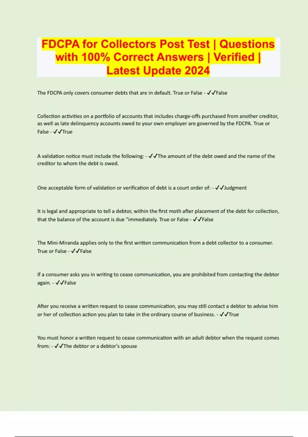 FDCPA for Collectors Post Test | Questions with 100% Correct Answers | Verified | Latest Update 2024