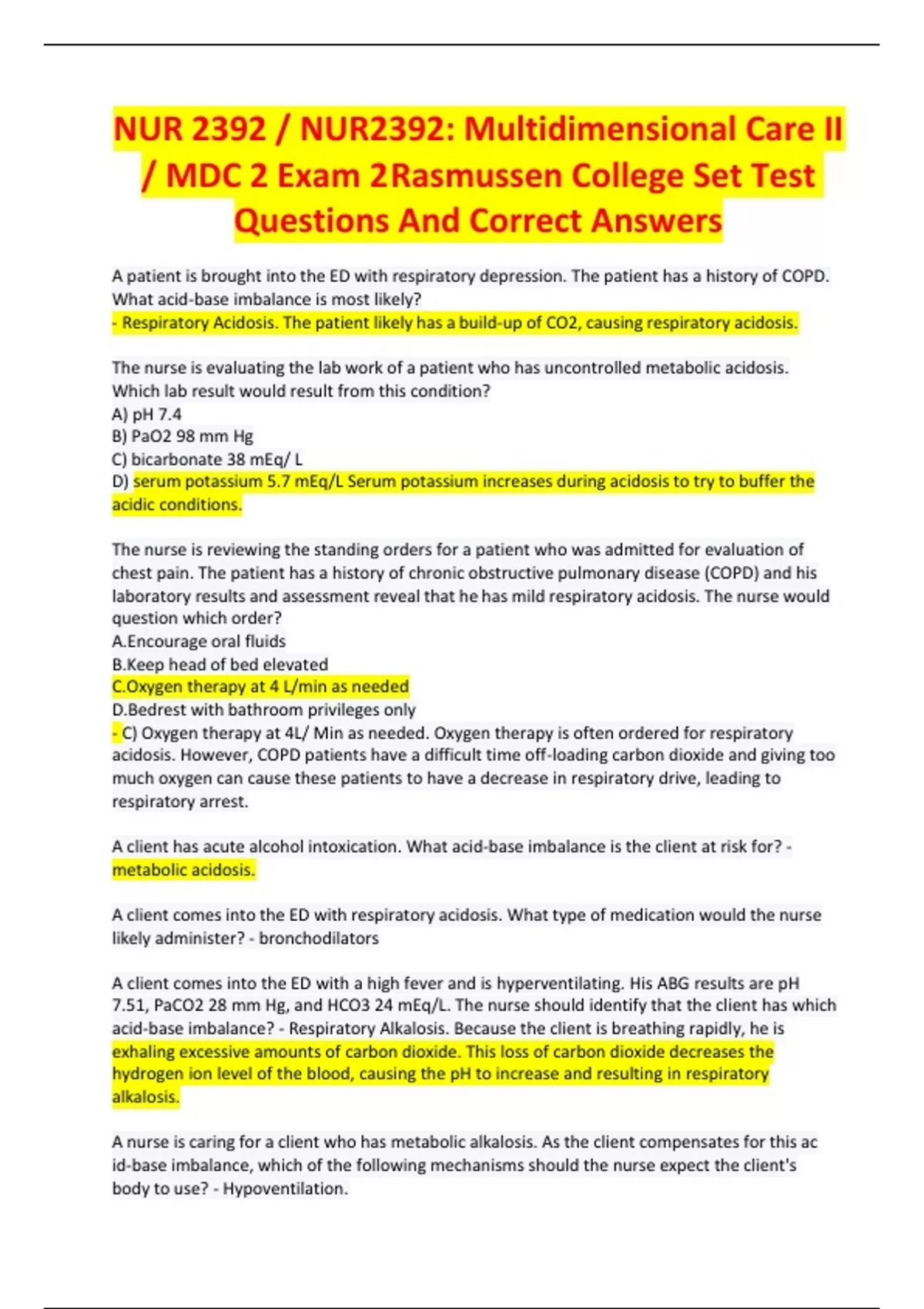 NUR 2392 / NUR2392: Multidimensional Care II / MDC 2 Exam 2Rasmussen College Set Test Questions And Correct Answers A patient is brought into the ED with respiratory depression. The patient has a history of COPD. What acid-base imbalance is most likely? - Respiratory Acidosis. The patient likely has a build-up of CO2, causing respiratory acidosis. The nurse is evaluating the lab work of a patient who has uncontrolled metabolic acidosis. Which lab result would result from this condition? A) pH 7.4 B) PaO2 98 mm Hg C) bicarbonate 38 mEq/ L D) serum potassium 5.7 mEq/L Serum potassium increases during acidosis to try to buffer the acidic conditions. The nurse is reviewing the standing orders for a patient who was admitted for evaluation of chest pain. The patient has a history of chronic obstructive pulmonary disease (COPD) and his laboratory results and assessment reveal that he has mild respiratory acidosis. The nurse would question which order? A.Encourage oral fluids B.Keep head of bed elevated C.Oxygen therapy at 4 L/min as needed D.Bedrest with bathroom privileges only - C) Oxygen therapy at 4L/ Min as needed. Oxygen therapy is often ordered for respiratory acidosis. However, COPD patients have a difficult time off-loading carbon dioxide and giving too much oxygen can cause these patients to have a decrease in respiratory drive, leading to respiratory arrest. A client has acute alcohol intoxication. What acid-base imbalance is the client at risk for? - metabolic acidosis. A client comes into the ED with respiratory acidosis. What type of medication would the nurse likely administer? - bronchodilators A client comes into the ED with a high fever and is hyperventilating. His ABG results are pH 7.51, PaCO2 28 mm Hg, and HCO3 24 mEq/L. The nurse should identify that the client has which acid-base imbalance? - Respiratory Alkalosis. Because the client is breathing rapidly, he is exhaling excessive amounts of carbon dioxide. This loss of carbon dioxide decreases the hydrogen ion level of the blood, causing the pH to increase and resulting in respiratory alkalosis.