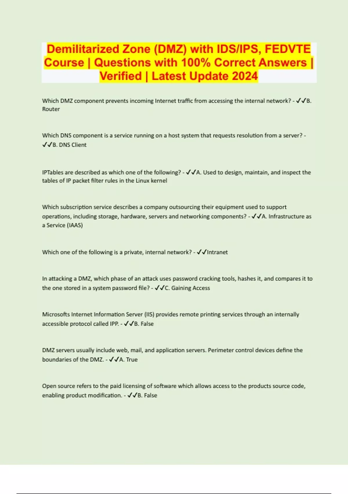 Demilitarized Zone (DMZ) with IDS/IPS, FEDVTE Course | Questions with 100% Correct Answers | Verified | Latest Update 2024