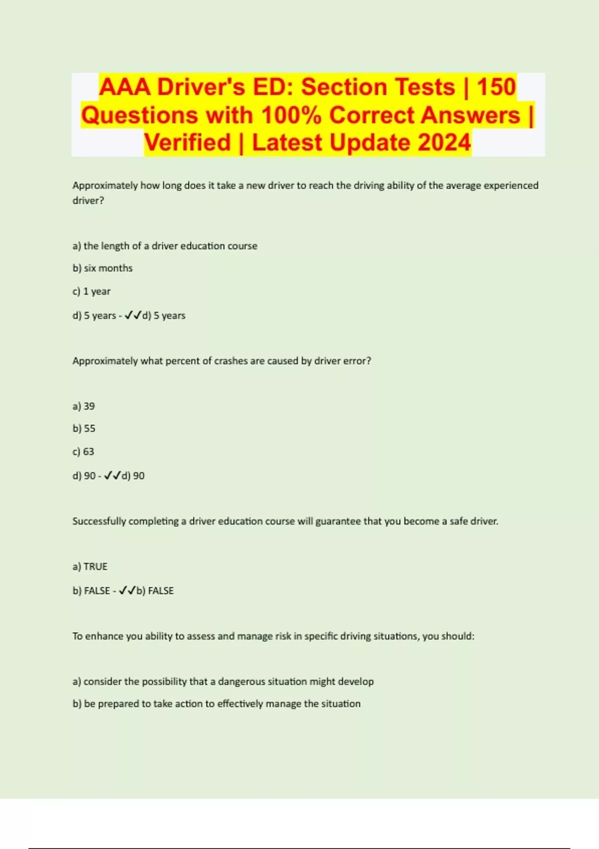 AAA Driver's ED: Section Tests | 150 Questions with 100% Correct Answers | Verified | Latest Update 2024