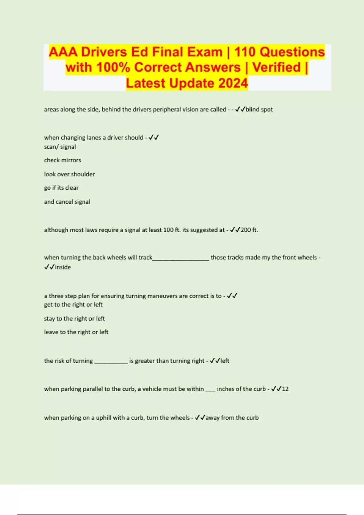 AAA Drivers Ed Final Exam | 110 Questions with 100% Correct Answers | Verified | Latest Update 2024