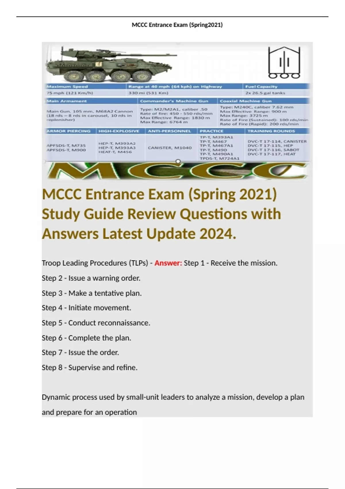 MCCC Entrance Exam (Spring 2021) Study Guide Review Questions with Answers Latest Update 2024. Terms like: Troop Leading Procedures (TLPs) - Answer: Step 1 - Receive the mission. Step 2 - Issue a warning order. Step 3 - Make a tentative plan. Step 4 - Initiate movement. Step 5 - Conduct reconnaissance. Step 6 - Complete the plan. Step 7 - Issue the order. Step 8 - Supervise and refine.