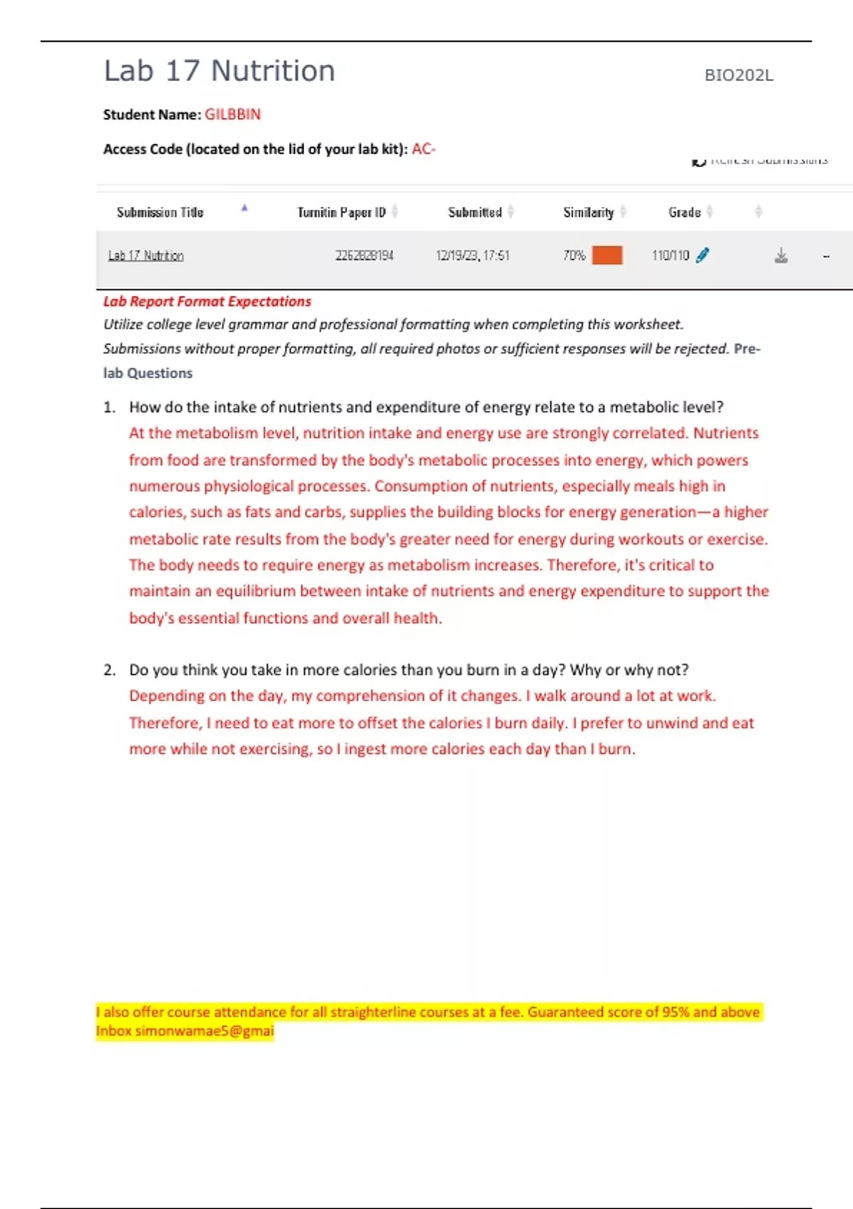 Lab 17 Nutrition BIO202L I also offer course attendance for all straighterline courses at a fee. Guaranteed score of 95% and above Inbox simonwamae5@gmai Student Name: GILBBIN Access Code (located on the lid of your lab kit): ACLab Report Format Expectat